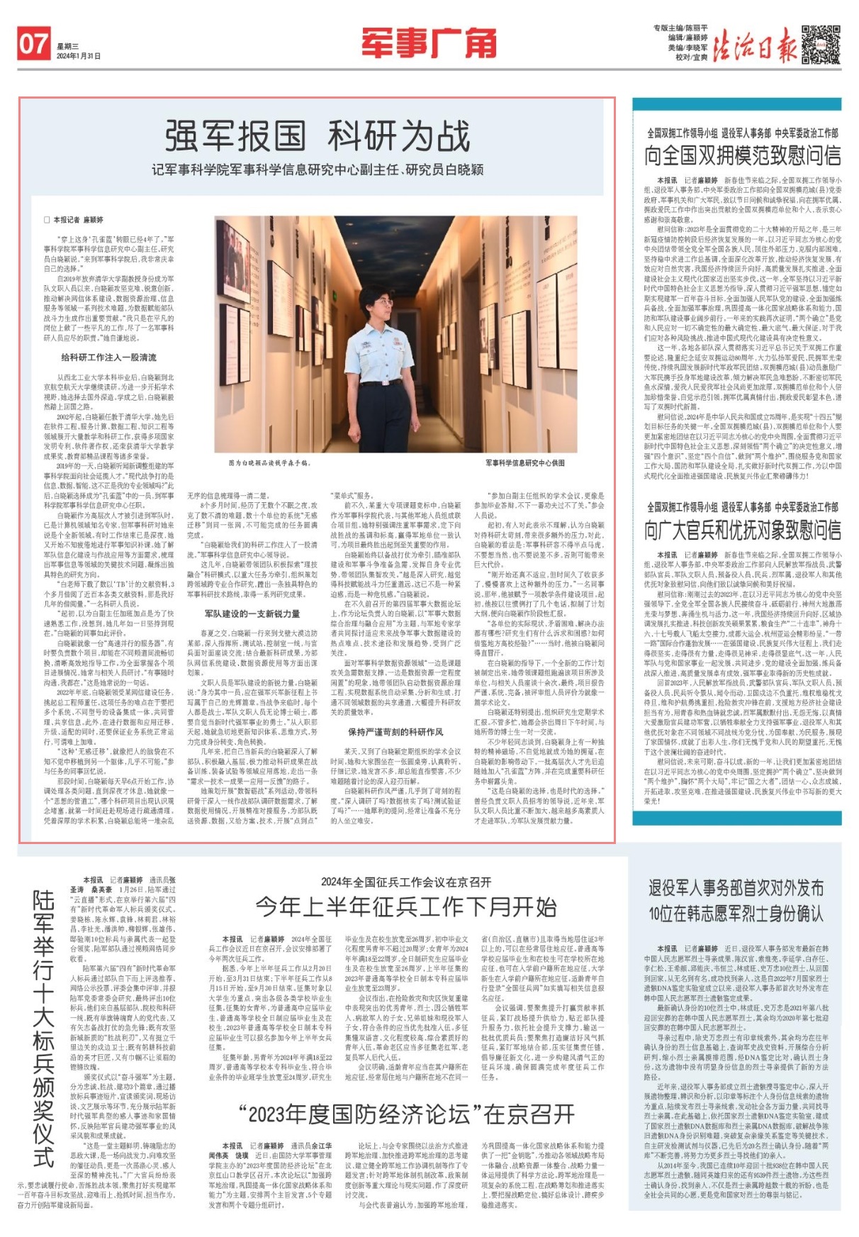 前不久,某重大專項(xiàng)課題競(jìng)標(biāo)中,白曉穎作為軍事科學(xué)院代表,與其他軍地人員組成聯(lián)合項(xiàng)目組。她特別強(qiáng)調(diào)注重軍事需求,定下向戰(zhàn)勝戰(zhàn)的基調(diào)和標(biāo)高,贏得軍地單位一致認(rèn)可,為項(xiàng)目最終勝出起到至關(guān)重要的作用。