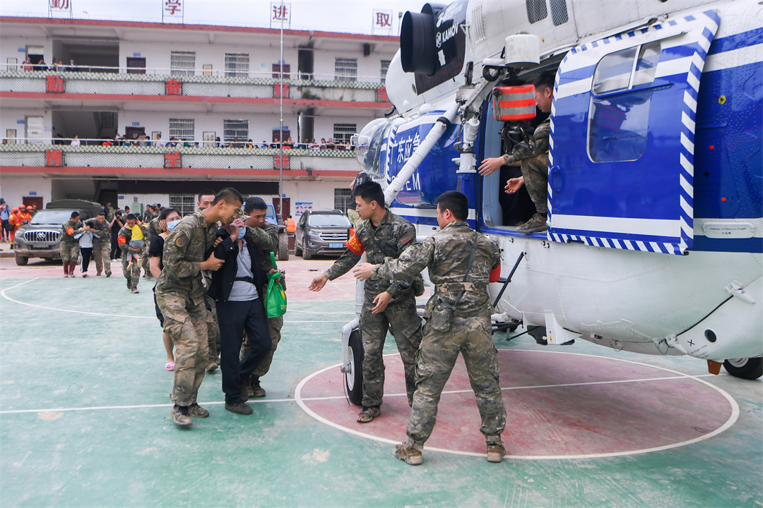 圖為武警廣東總隊韶關(guān)支隊官兵派出20名官兵對江灣鎮(zhèn)城區(qū)片區(qū)進行搜樓,轉(zhuǎn)移受難群眾及物資。