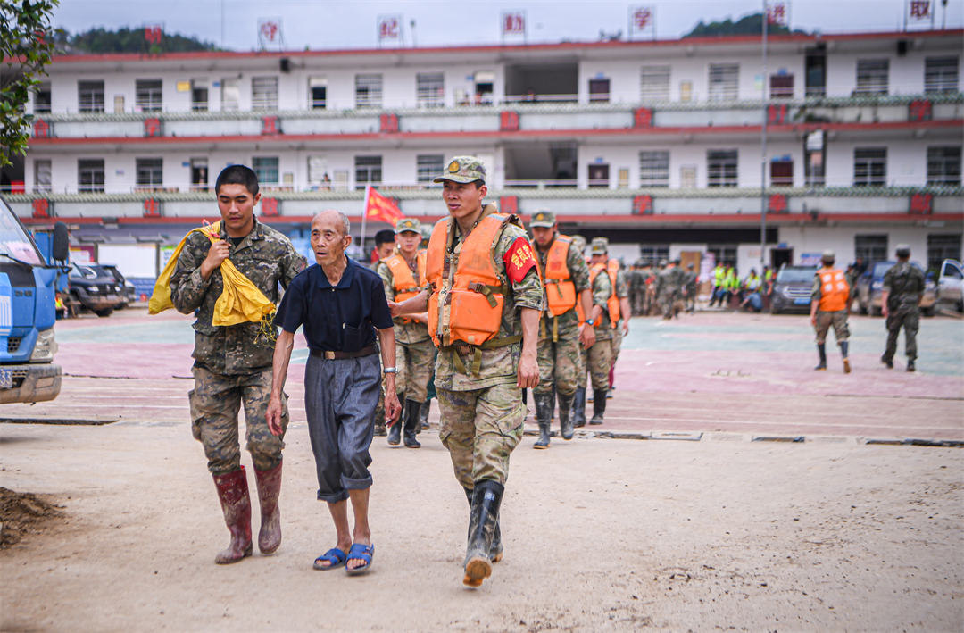 “凌晨6點天還沒亮,所有官兵就帶上干糧出發(fā)到各個村去疏散群眾?!睏钪艺f,江灣鎮(zhèn)下屬6個行政村有大大小小43個自然村,除情況最嚴重的梁屋村派出60人外,鍋溪村、圍坪村、江灣中心小學各派出30名兵力,胡屋村派出40名兵力,劃分若干個小組,聯(lián)合地方救援人員,按照先遣勘察、重裝開道、輕裝跟進、觀察警戒的方式,逐村逐戶搜索勸離,剩余人員就在江灣中學和江灣鎮(zhèn)政府協(xié)助轉(zhuǎn)運群眾。