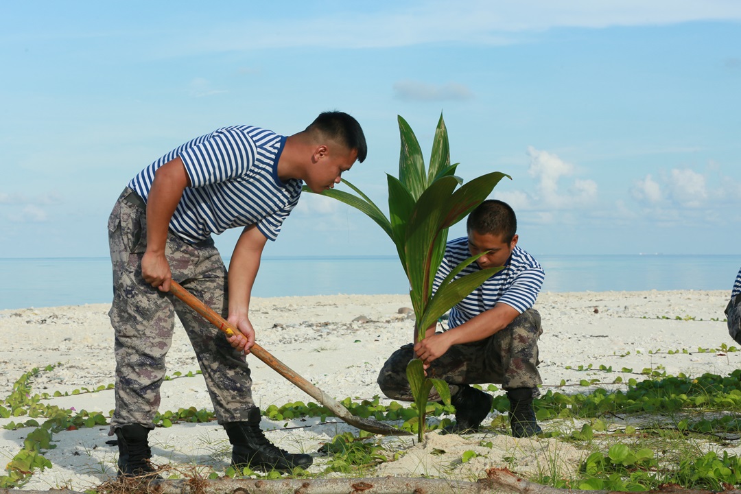 圖為西沙守備部隊(duì)官兵種植椰子樹。張鐘鑫 攝