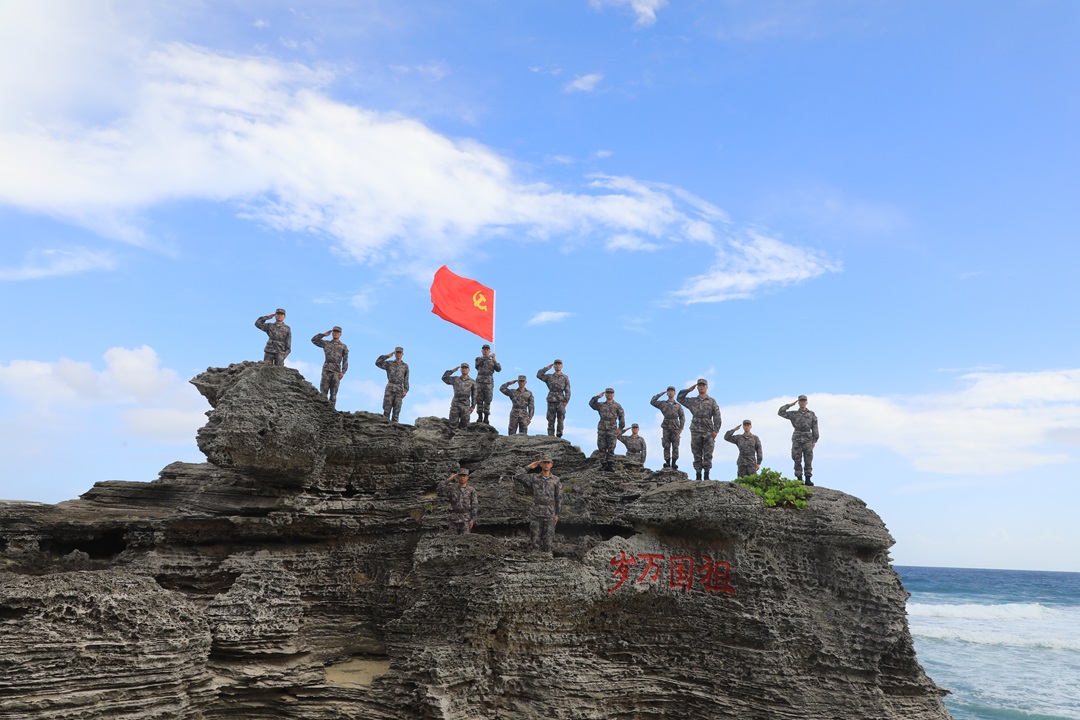 清晨,站在中建島瞭望哨上,一面巨幅黨旗和國(guó)旗,以及“祖國(guó)萬(wàn)歲”“黨徽永耀”8個(gè)大字躍入眼簾。這幅畫卷是官兵們用島上特有的植物——海馬草種植出來(lái)的。這8個(gè)字,是島上官兵的信仰旗幟和精神豐碑。同時(shí),海馬草具有很好的固水、固沙作用,也為防止島上水土流失,建設(shè)綠色海島起到重要作用。