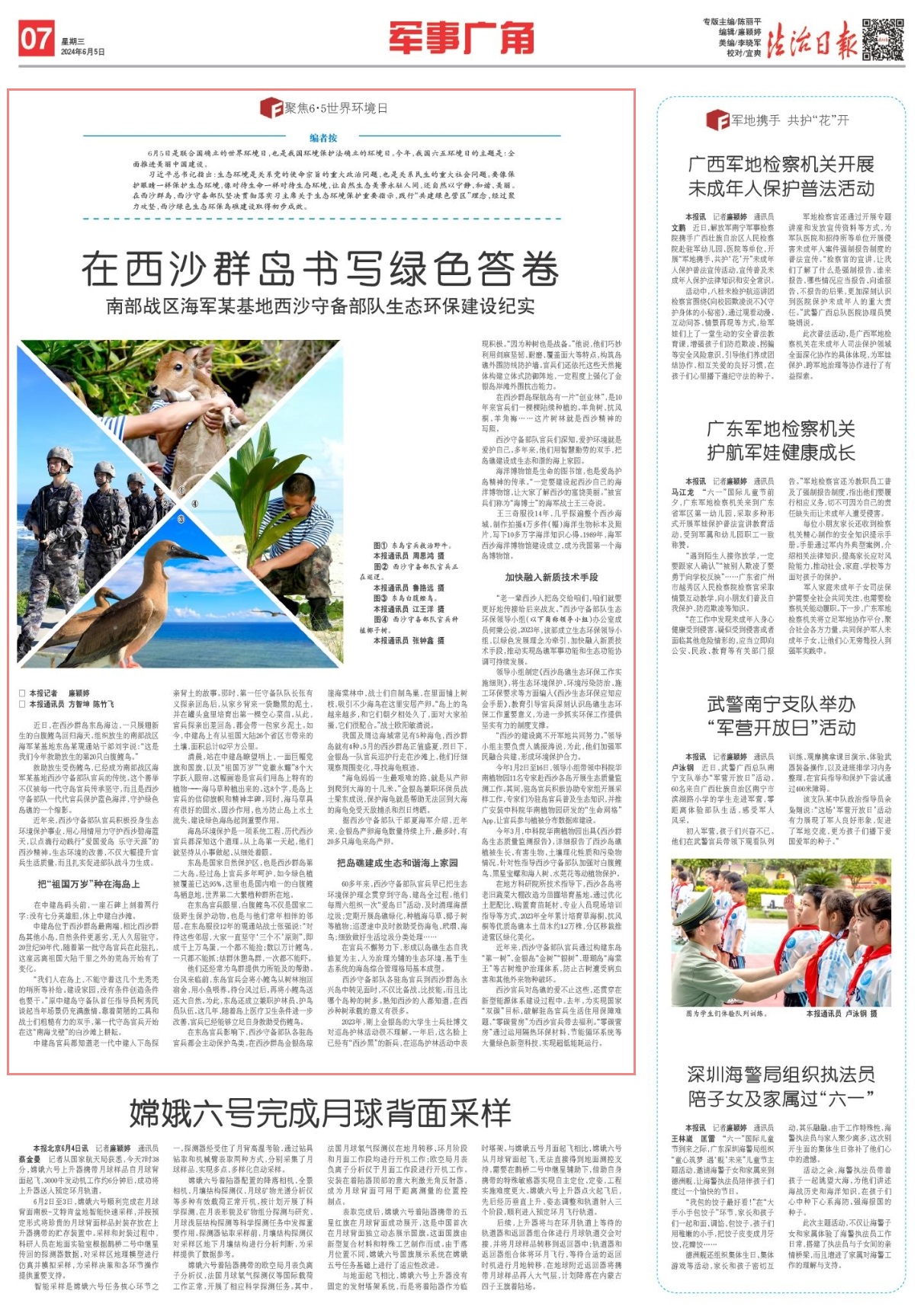 習(xí)近平總書記指出:生態(tài)環(huán)境是關(guān)系黨的使命宗旨的重大政治問題,也是關(guān)系民生的重大社會(huì)問題。要像保護(hù)眼睛一樣保護(hù)生態(tài)環(huán)境,像對(duì)待生命一樣對(duì)待生態(tài)環(huán)境,讓自然生態(tài)美景永駐人間,還自然以寧?kù)o、和諧、美麗。在西沙群島,西沙守備部隊(duì)堅(jiān)決貫徹落實(shí)習(xí)主席關(guān)于生態(tài)環(huán)境保護(hù)重要指示,踐行“共建綠色營(yíng)區(qū)”理念,經(jīng)過聚力攻堅(jiān),西沙綠色生態(tài)環(huán)保島礁建設(shè)取得初步成效。