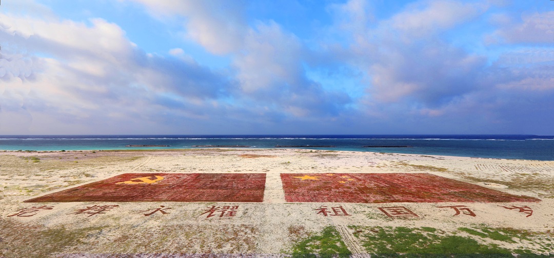 圖為“黨徽永耀 祖國(guó)萬(wàn)歲”西沙中建島官兵種植海馬草,鋪成黨旗、國(guó)旗的形狀。