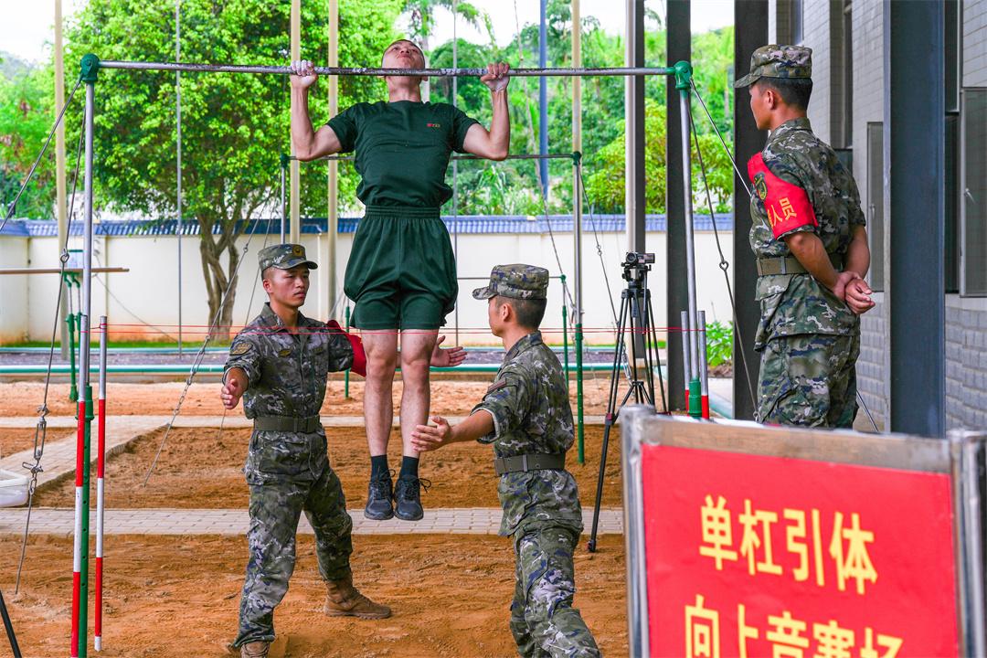 圖為參賽官兵正在進(jìn)行單杠引體向上競賽。