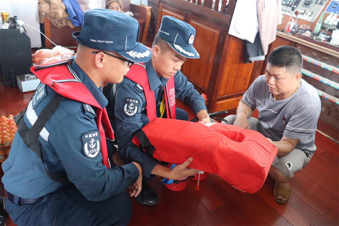 圖為8月15日,廣西北海海警局在轄區(qū)海域幫助漁民檢查漁船設(shè)施,為開漁做好準(zhǔn)備。