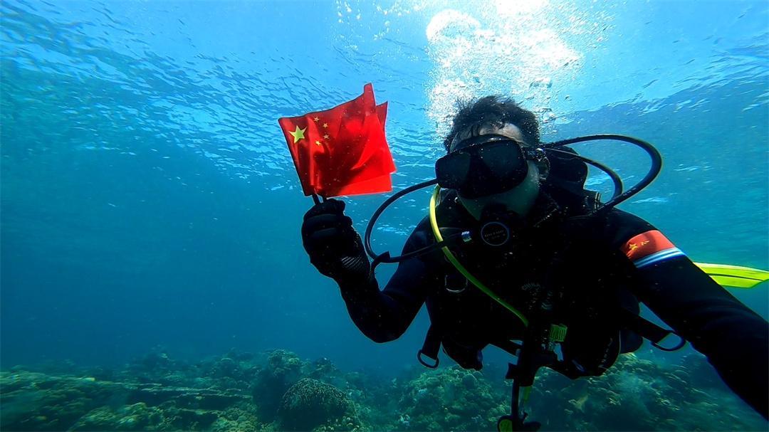 圖為潛水員在水下展示國(guó)旗。