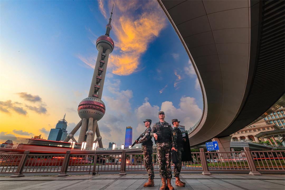 迎著霞光,武警上??傟?duì)執(zhí)勤第二支隊(duì)某中隊(duì)巡邏車穿梭在上海市浦東新區(qū)陸家嘴金融貿(mào)易區(qū),這里是官兵常年守護(hù)的地方。