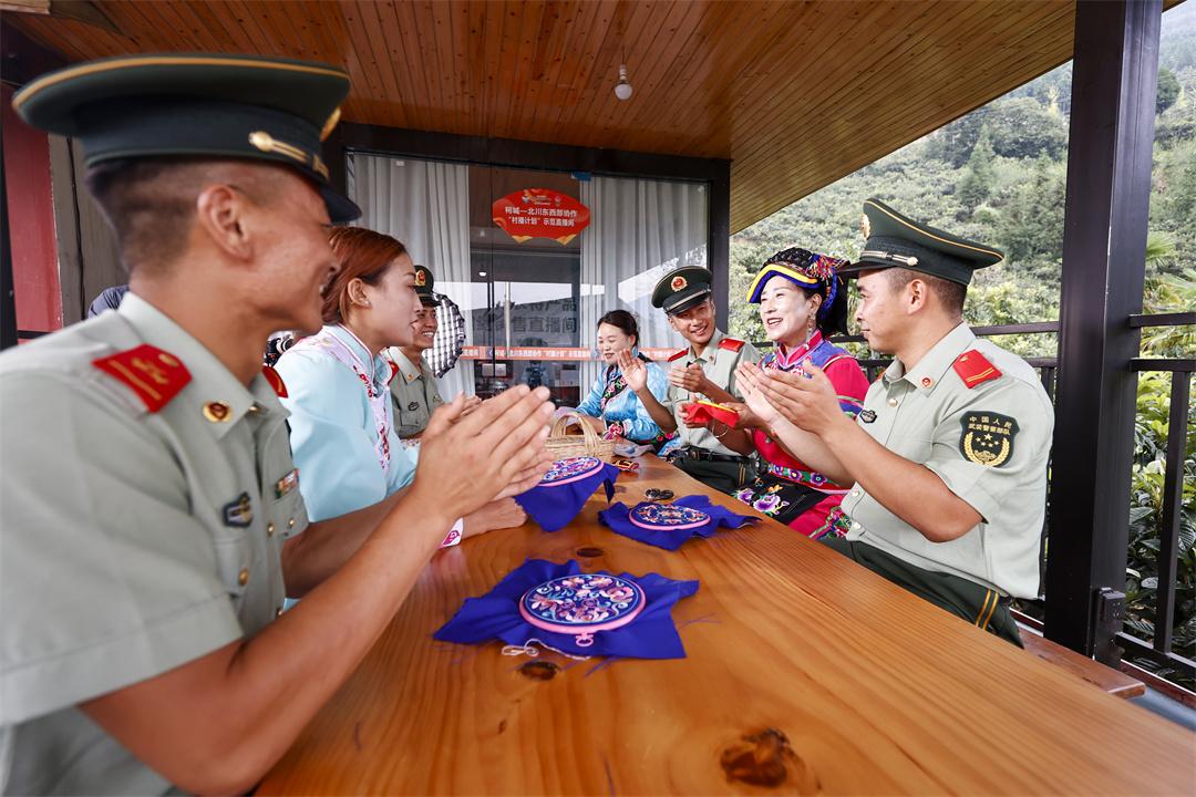 圖為武警官兵與村里的繡娘合唱羌族歌曲。