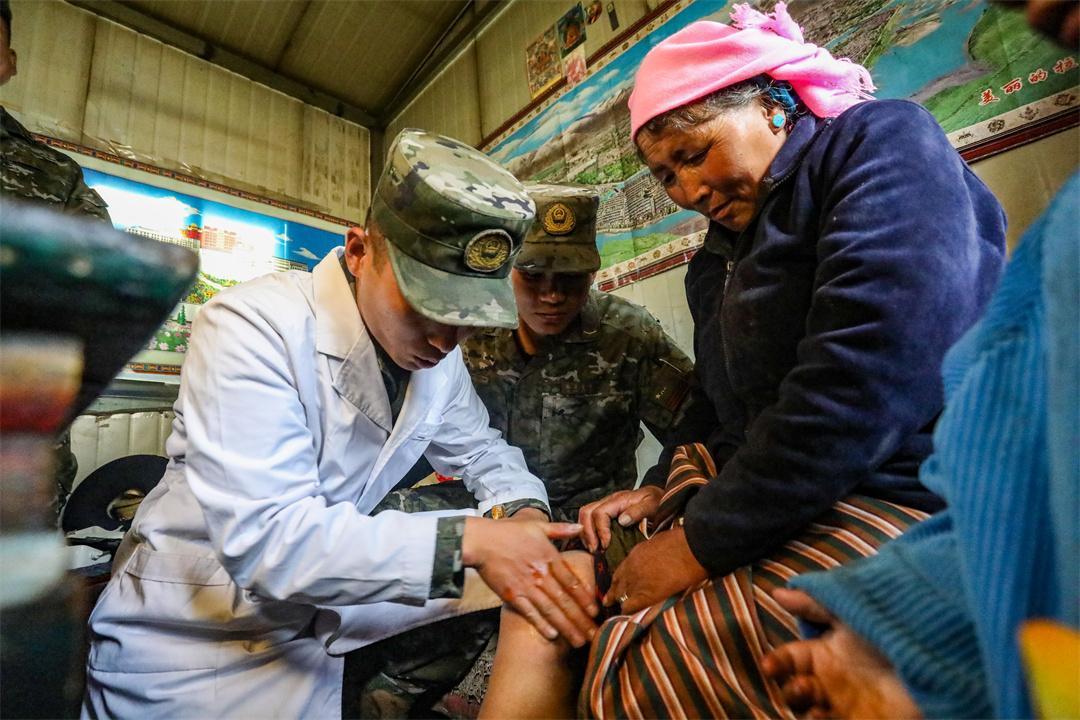 圖為武警官兵為藏族老人巡診。