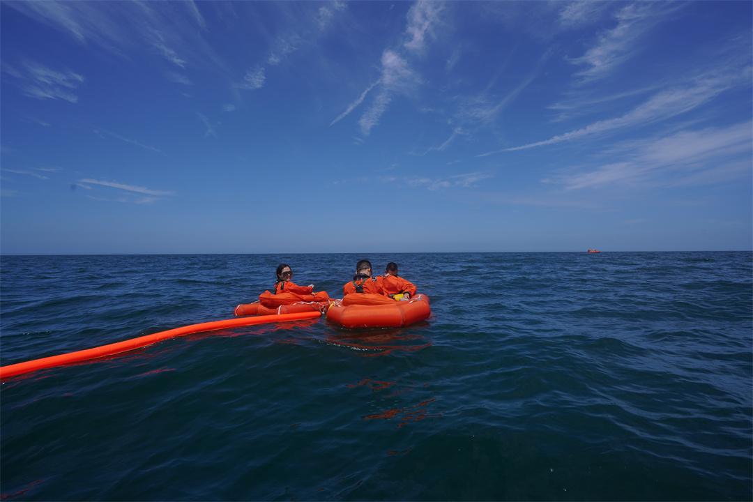 圖為王浩澤(左)參加海上救生訓練??追街?攝