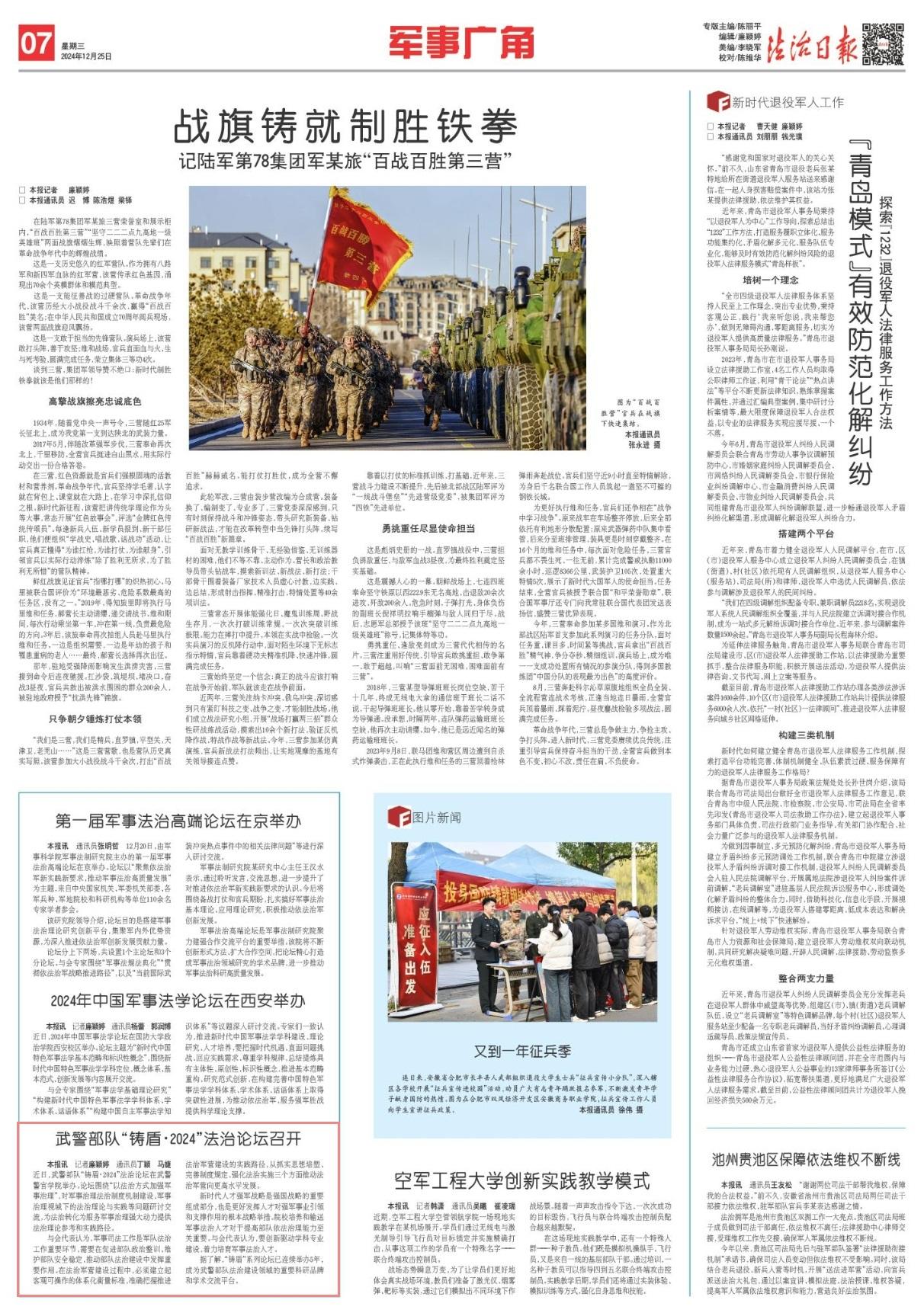 近日,武警部隊(duì)“鑄盾·2024”法治論壇在武警警官學(xué)院舉辦。論壇圍繞“以法治方式加強(qiáng)軍事治理”,對(duì)軍事治理法治制度機(jī)制建設(shè)、軍事治理視域下的法治理論與實(shí)踐等問題研討交流,為法治轉(zhuǎn)化為服務(wù)軍事治理強(qiáng)大動(dòng)力提供法治理論參考和實(shí)踐路徑。