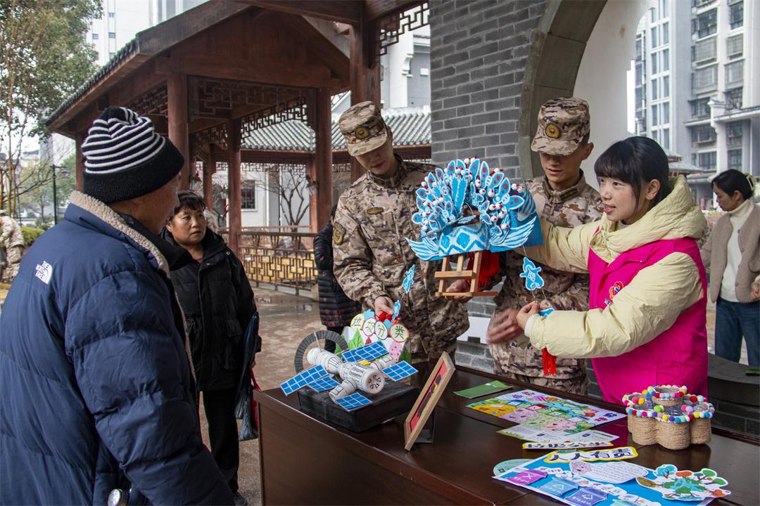 圖為志愿者與武警官兵一起展示環(huán)保手工藝品。