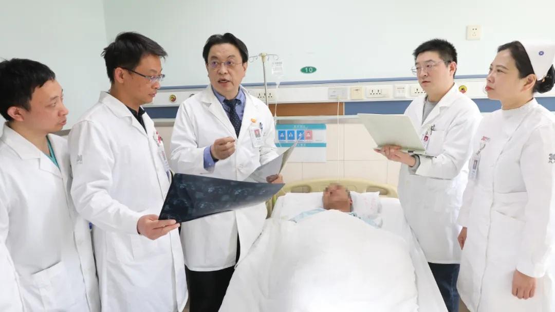 圖為姜凱主任帶領(lǐng)團(tuán)隊醫(yī)務(wù)人員在查房中討論病情,并指導(dǎo)手術(shù)后的病人進(jìn)行科學(xué)訓(xùn)練,加快康復(fù)進(jìn)度。