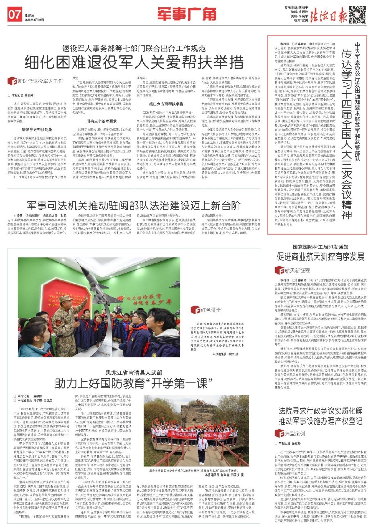 中央軍委辦公廳日前發(fā)出通知,要求解放軍和武警部隊認真?zhèn)鬟_學習十四屆全國人大三次會議精神,認真學習貫徹習主席在解放軍和武警部隊代表團全體會議上的重要講話精神。