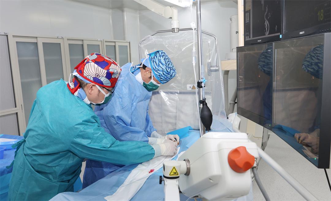 早一秒手術就多一絲康復希望。劉愛軍馬上抽組科室精干力量組成專家救治小組,實施導管介入取栓手術。醫(yī)護人員從右側大腿腹股溝股動脈處建立通路,在支架輔助下,取栓導管安全精準抵達堵塞血管處。不多久,在劉愛軍團隊細心操作下,比頭發(fā)還細的導絲成功穿過血栓,并引領支架成功取出血栓。