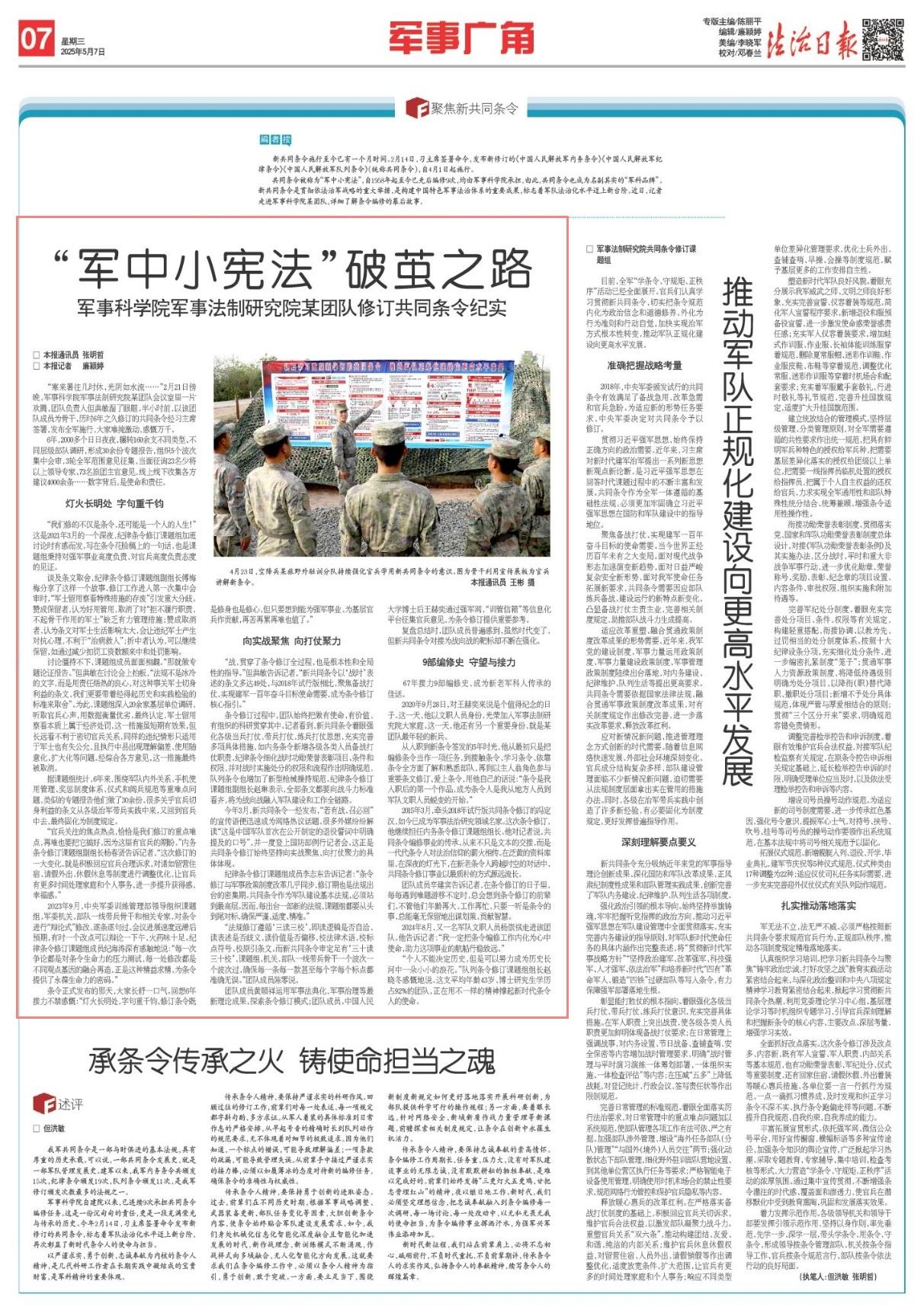 共同條令被稱(chēng)為“軍中小憲法”,自1958年起至今已先后編修9次,均由軍事科學(xué)院承擔(dān),由此,共同條令也成為名副其實(shí)的“軍科品牌”。新共同條令是貫徹依法治軍戰(zhàn)略的重大舉措,是構(gòu)建中國(guó)特色軍事法治體系的重要成果,標(biāo)志著軍隊(duì)法治化水平邁上新臺(tái)階。近日,記者走進(jìn)軍事科學(xué)院某團(tuán)隊(duì),詳細(xì)了解條令編修的幕后故事。
