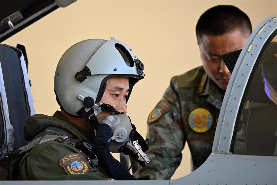 圖為4月19日,埃及空軍某基地,參加中?!拔拿髦?2025”空軍聯(lián)合訓(xùn)練的中國空軍飛行員進(jìn)行起飛前檢查。余紅春 攝