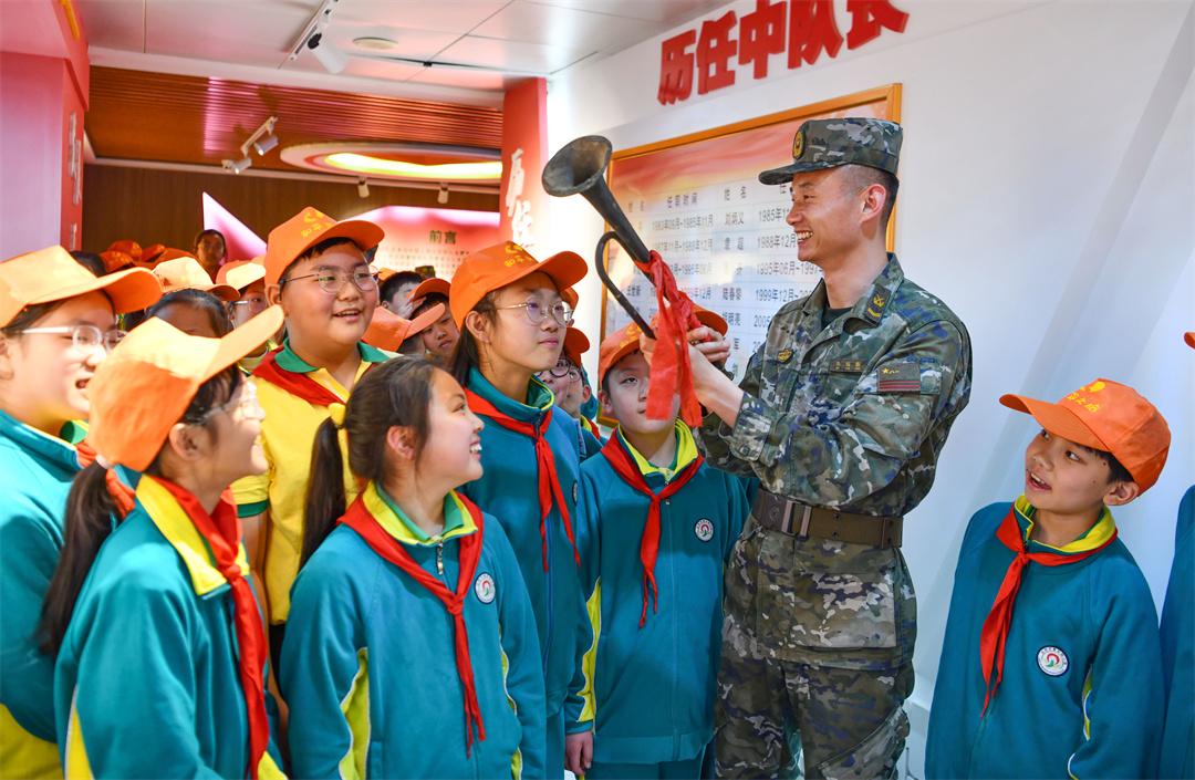 圖為在軍營開放日活動(dòng)中,中隊(duì)?wèi)?zhàn)士向?qū)W生講述老軍號(hào)的故事。徐偉 攝