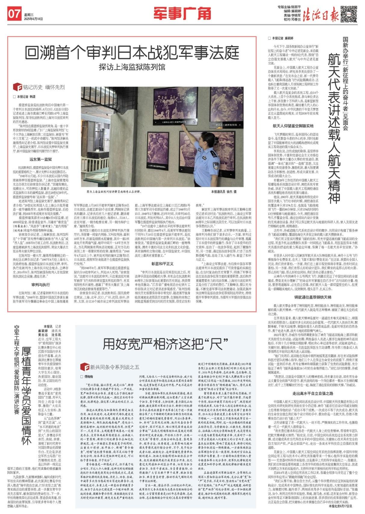 “上海設(shè)立軍事法庭,為后續(xù)中國各軍事法庭審判日本戰(zhàn)犯提供了可資借鑒的實(shí)踐經(jīng)驗(yàn)。在當(dāng)時復(fù)雜的歷史背景下,明確了軍事司法在懲治戰(zhàn)爭犯罪方面的重要職責(zé)。戰(zhàn)后秩序重建需要有力的司法保障,上海對日戰(zhàn)犯審判正是分擔(dān)了這樣的責(zé)任?!蓖跚诜逭f,要以史為鑒,不斷完善軍事司法制度建設(shè),加強(qiáng)武裝沖突法特別是懲治戰(zhàn)爭犯罪規(guī)則運(yùn)用研究,持續(xù)提升軍事審判質(zhì)效,為強(qiáng)軍興軍提供堅強(qiáng)法治保障。
