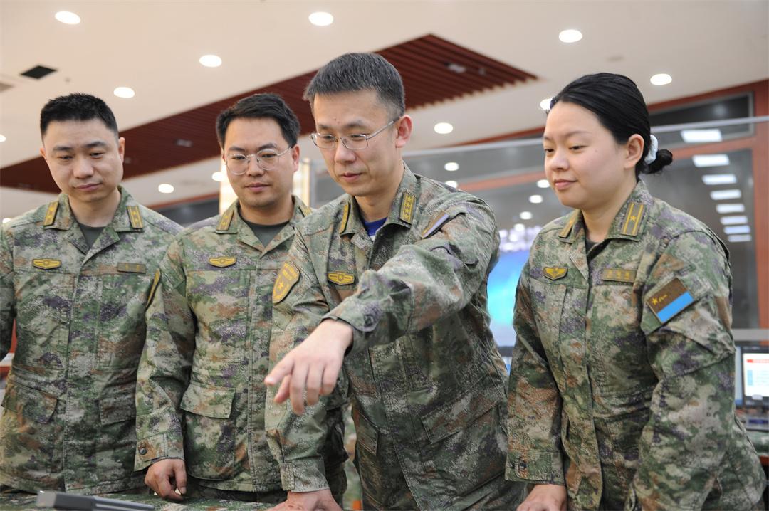圖為吳琳(右二)和團隊成員分析評估戰(zhàn)場態(tài)勢。
