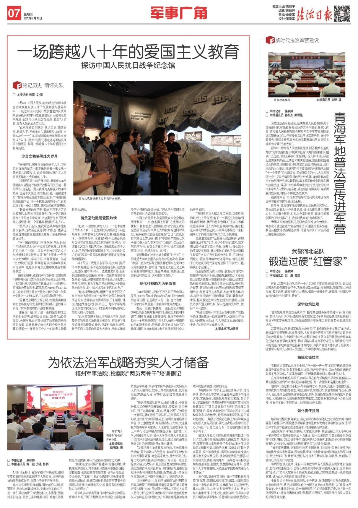 “此次展覽的主題是‘銘記歷史、緬懷先烈、珍愛和平、開創(chuàng)未來’,展出照片1525張、文物3237件……”抗戰(zhàn)館講解員為參觀群眾介紹。7月27日,《法治日報》記者走進(jìn)宛平城抗戰(zhàn)館主題展覽,探尋一場跨越八十年的愛國主義教育歷程。