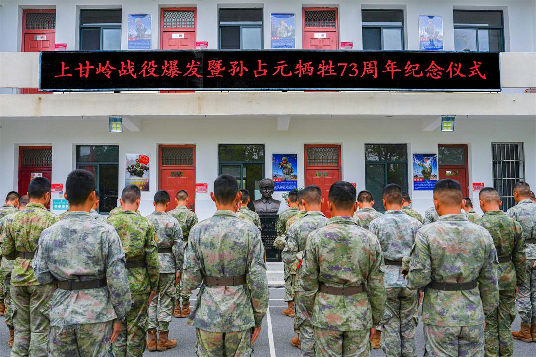 紀(jì)念儀式開始,連隊(duì)官兵仔細(xì)整理花籃綢帶,并脫帽默哀,深切緬懷孫占元老排長(zhǎng)?;ɑ@上“紀(jì)念上甘嶺戰(zhàn)役爆發(fā)73周年”“紀(jì)念一級(jí)英雄孫占元犧牲73周年”的綢帶隨風(fēng)飄揚(yáng)。
