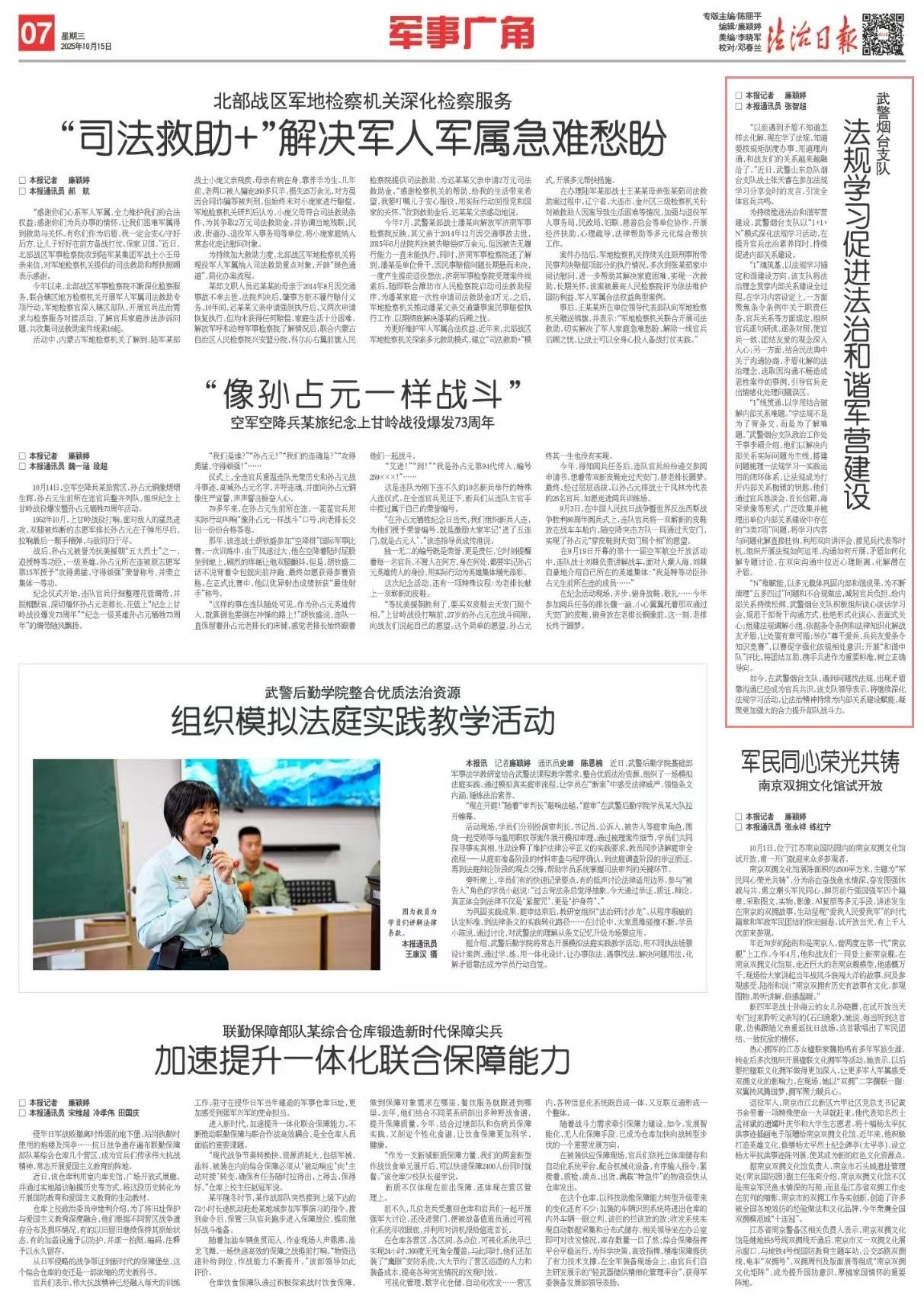 為持續(xù)推進(jìn)法治和諧軍營建設(shè),武警煙臺支隊以“1+1+N”模式深化法規(guī)學(xué)習(xí)活動,在提升官兵法治素養(yǎng)同時,持續(xù)促進(jìn)內(nèi)部關(guān)系建設(shè)。
