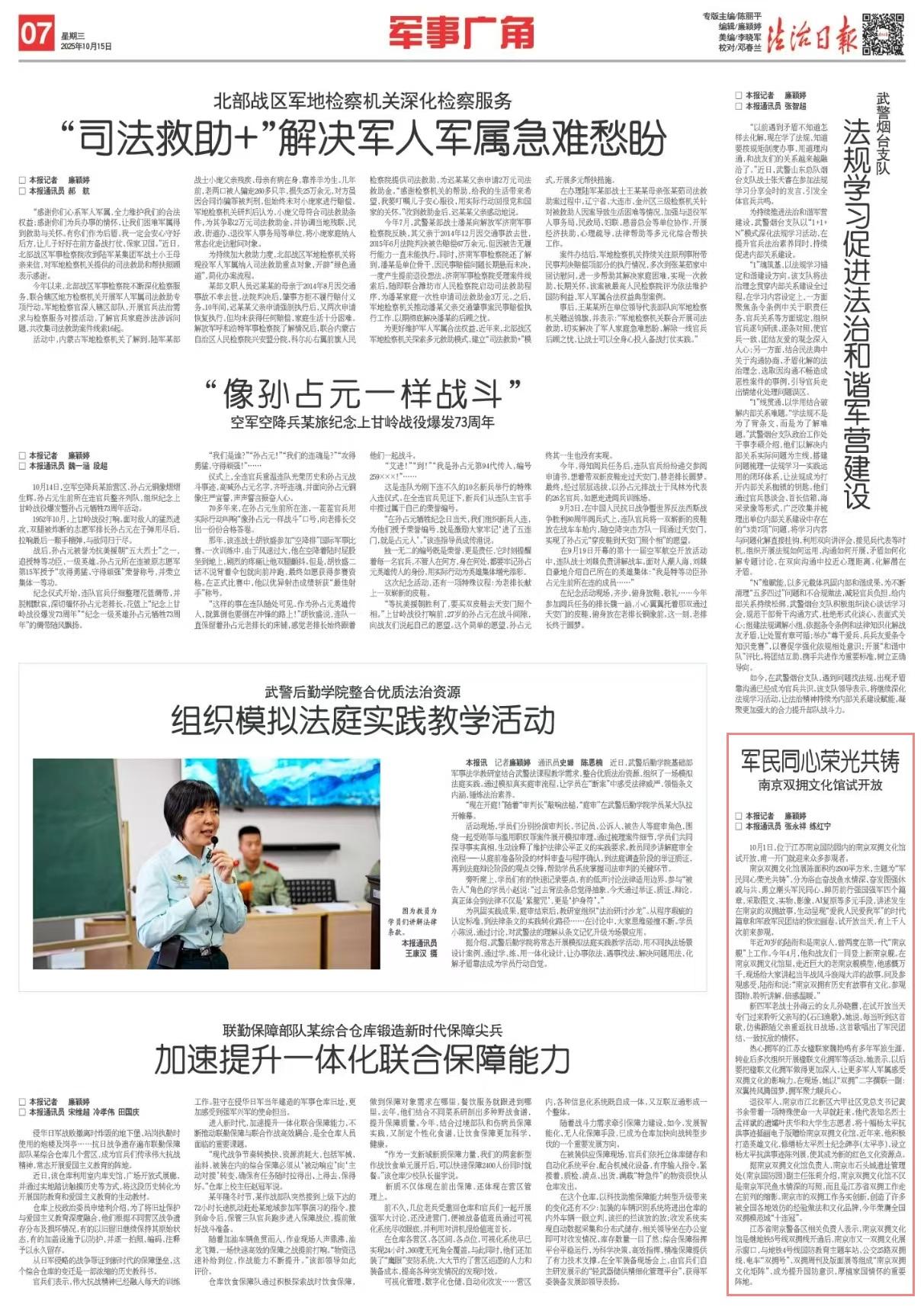 江蘇省南京警備區(qū)相關(guān)負(fù)責(zé)人表示,南京雙擁文化館是繼地鐵5號(hào)線雙擁線開(kāi)通后,南京市又一雙擁文化展示窗口,與地鐵4號(hào)線國(guó)防教育主題車站、公交25路雙擁線、電車“雙擁號(hào)”、雙擁周刊及版面展等組成“南京雙擁文化矩陣”,成為提升國(guó)防意識(shí),厚植家國(guó)情懷的重要陣地。