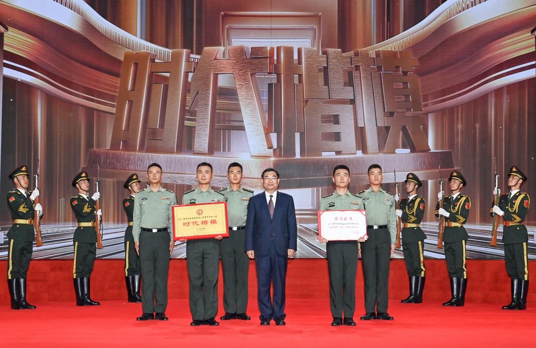 圖為在“時(shí)代楷模”發(fā)布儀式上,陸軍第八十二集團(tuán)軍某旅“劉老莊連”官兵代表領(lǐng)取“時(shí)代楷?!豹勁坪妥C書。張永進(jìn) 攝