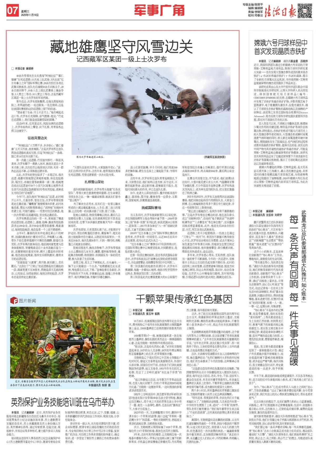 第一次踏上巡邏路,行至獨(dú)木橋時(shí),一陣狂風(fēng)襲來,次羅布腳下一滑跌入冰河,被戰(zhàn)友追出十多米才救上岸。這次經(jīng)歷讓他深刻認(rèn)識(shí)到,光有一腔熱血遠(yuǎn)遠(yuǎn)不夠,必須練就過硬本領(lǐng)。