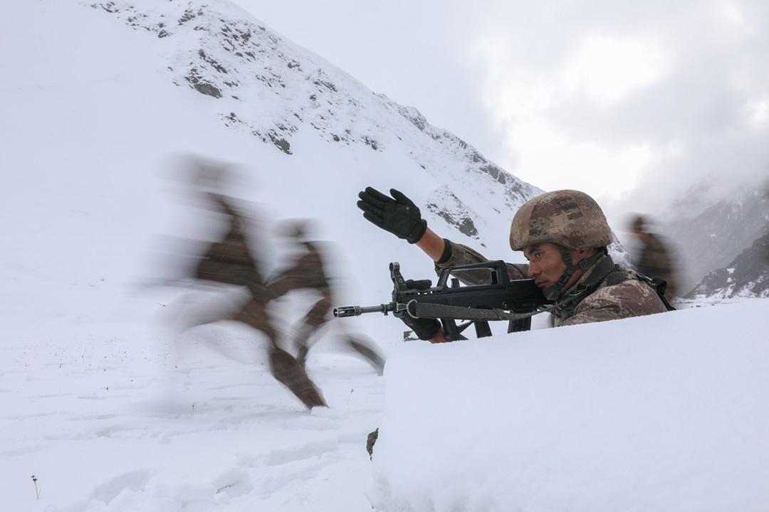 圖為寒風(fēng)凜冽中,次羅布(右一)與戰(zhàn)友屈身前行攀爬險(xiǎn)坡。