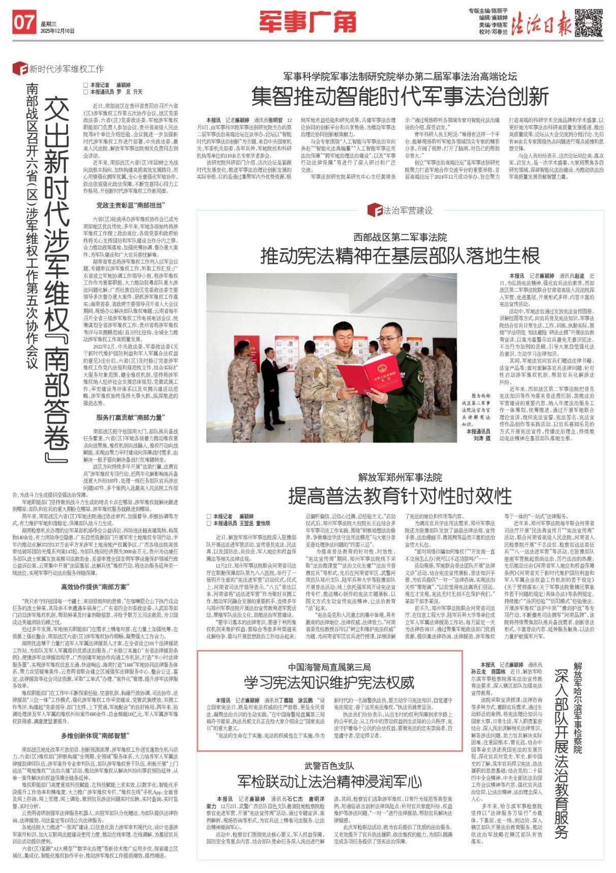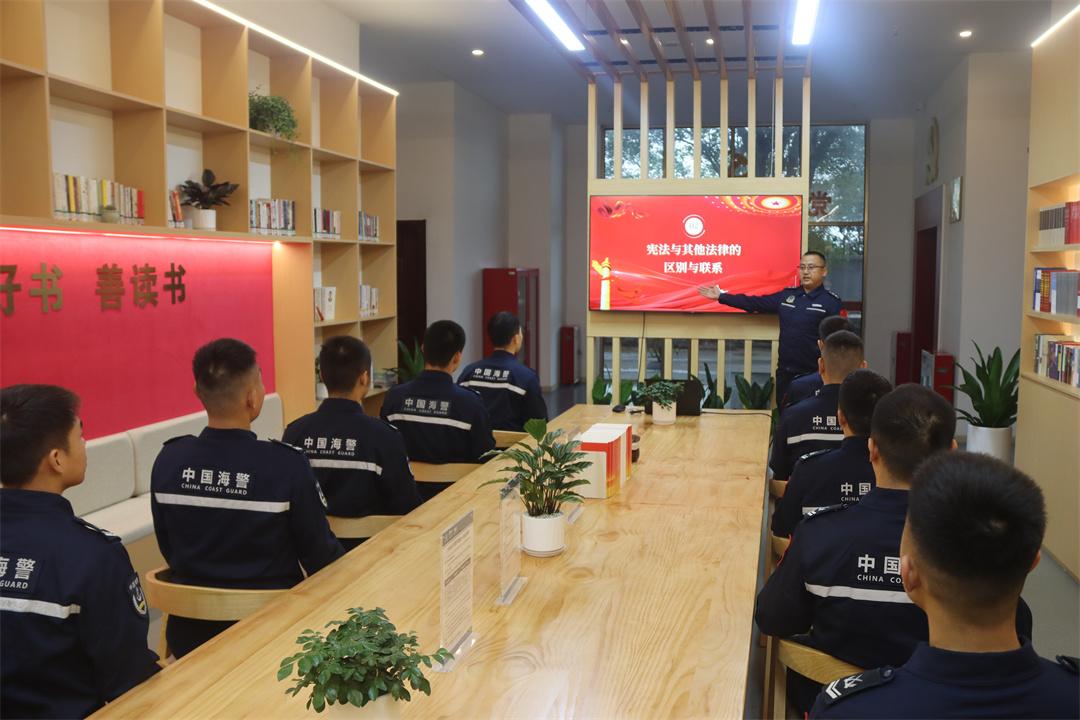 “設(shè)立國家憲法日,既是對(duì)憲法權(quán)威的莊嚴(yán)致敬,更是全民普法、凝聚法治共識(shí)的生動(dòng)實(shí)踐。”在中國海警局直屬第三局徜舟書屋里,執(zhí)法員郭文兵正在給大家介紹設(shè)立“國家憲法日”的重大意義。