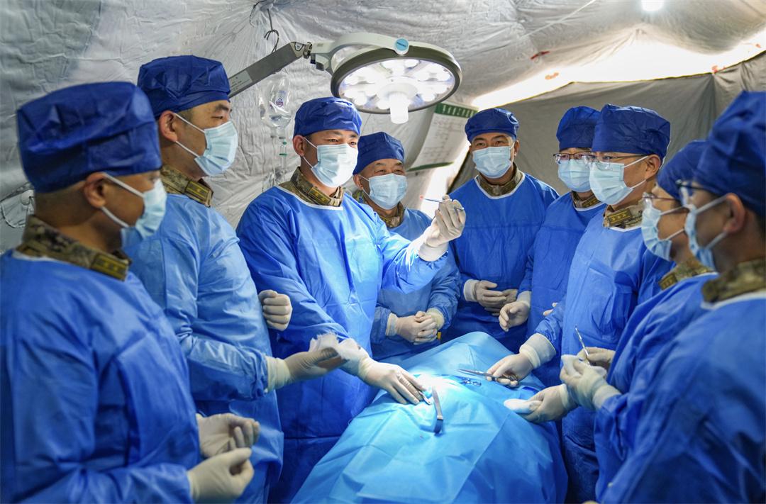 圖為博士團隊在野戰(zhàn)醫(yī)院帳篷里結合手術方案研究處置傷情。張永進 攝