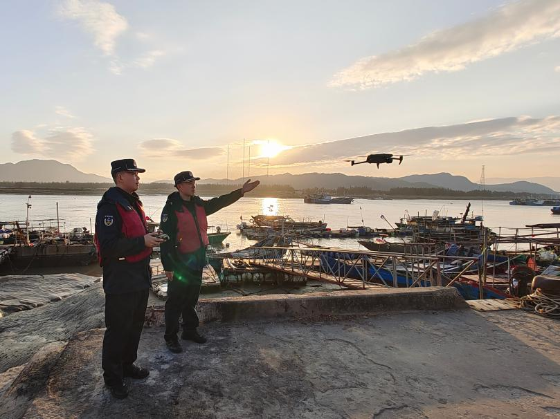 圖為海警執(zhí)法員利用無(wú)人機(jī)對(duì)轄區(qū)漁港岙口進(jìn)行巡查。袁冠卿 攝