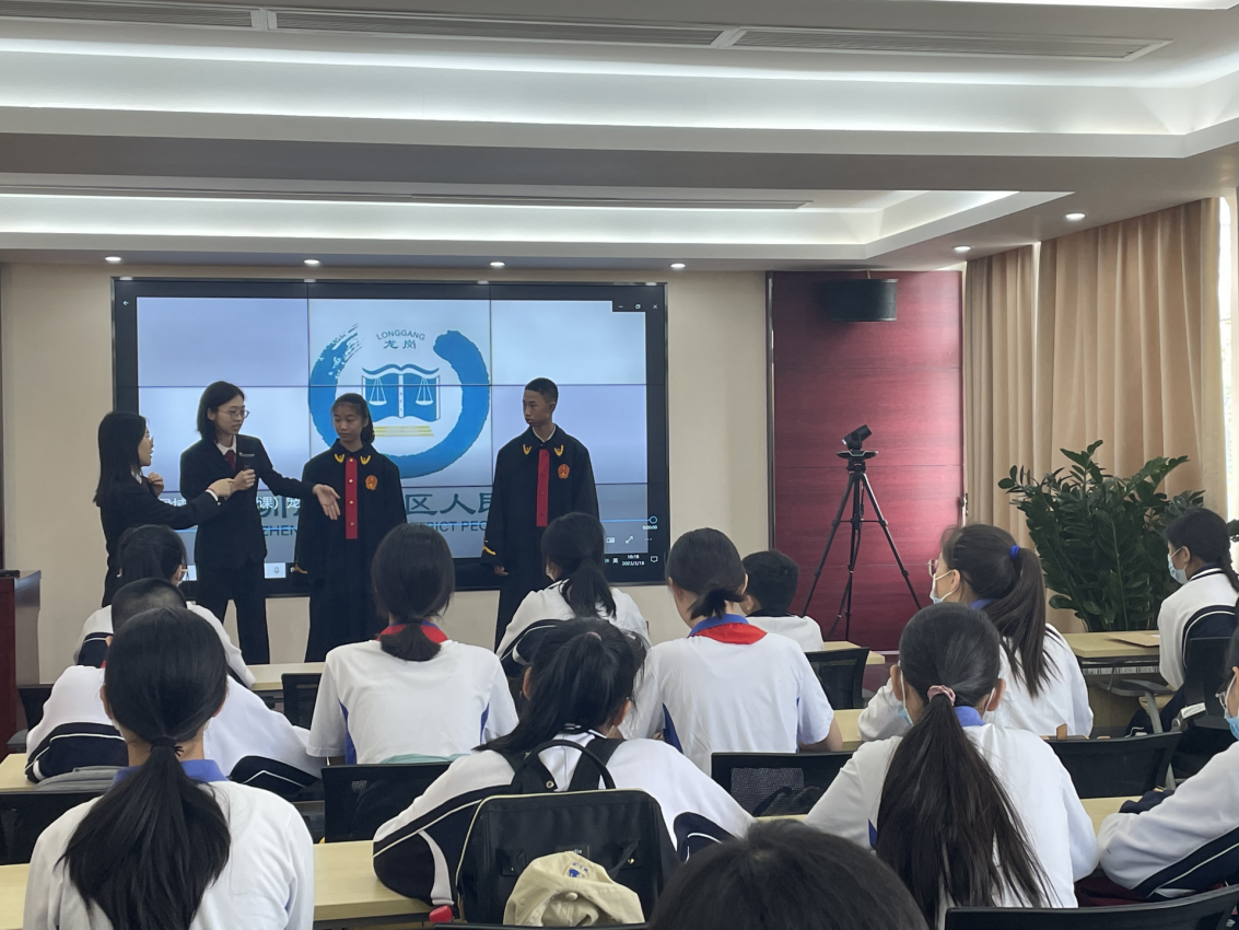 同學們在法官助理的引導下參觀了大鵬法庭,法官助理用通俗易懂的語言介紹了法庭設置、審判職能和審判流程,向同學們揭開法庭的神秘面紗,讓同學們對法庭和審判有了直觀感受。大鵬新區(qū)政法辦工作人員對公檢法職能及相互關系進行了介紹。針對同學們關心的問題,法官助理通過以案說法、體驗式學法、視頻科普、提問互動等寓教于樂的授課方式作了專業(yè)解答,同學們豁然開朗。