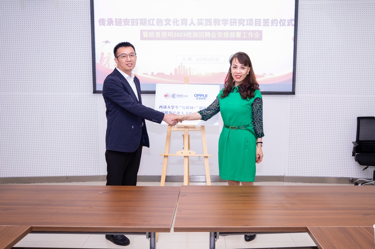 (西北政法大學(xué)新聞傳播學(xué)院(藝術(shù)學(xué)院)副院長(zhǎng)與歐普照明股份有限公司陜西分公司副總經(jīng)理王世新為“西部大學(xué)生互聯(lián)網(wǎng)+大學(xué)生創(chuàng)新創(chuàng)業(yè)數(shù)字新媒體產(chǎn)業(yè)人才孵化實(shí)訓(xùn)基地”揭牌)