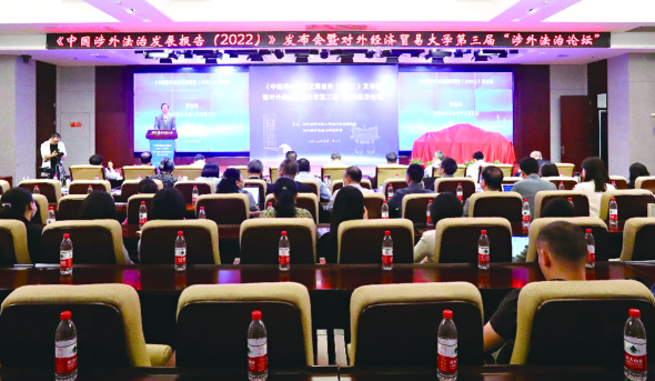 日前,對外經(jīng)濟(jì)貿(mào)易大學(xué)涉外法治研究院和法學(xué)院共同舉辦的《中國涉外法治發(fā)展報(bào)告(2022)》發(fā)布會暨對外經(jīng)濟(jì)貿(mào)易大學(xué)第三屆“涉外法治論壇”舉行。本年度報(bào)告共包含11個(gè)專題,從參與全球治理、立法、執(zhí)法、司法、法律服務(wù)和法學(xué)研究等方面展現(xiàn)了我國涉外法治發(fā)展的成績、問題和建議。來自政府部門、實(shí)務(wù)機(jī)構(gòu)和校內(nèi)外專家學(xué)者代表出席本次發(fā)布會。