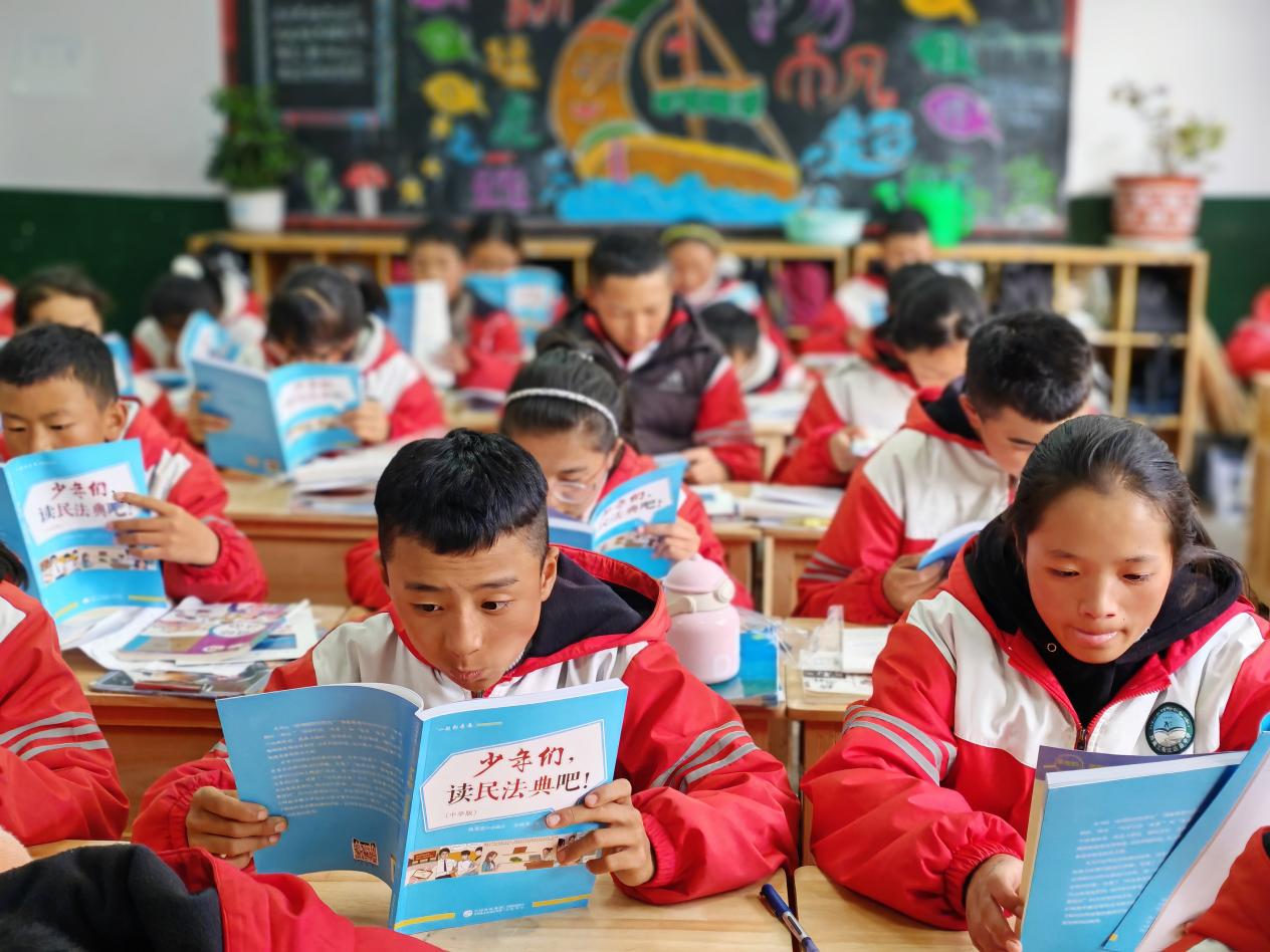 西藏自治區(qū)林芝市工布江達(dá)縣中學(xué)學(xué)生在閱讀《少年們,讀民法典吧!》