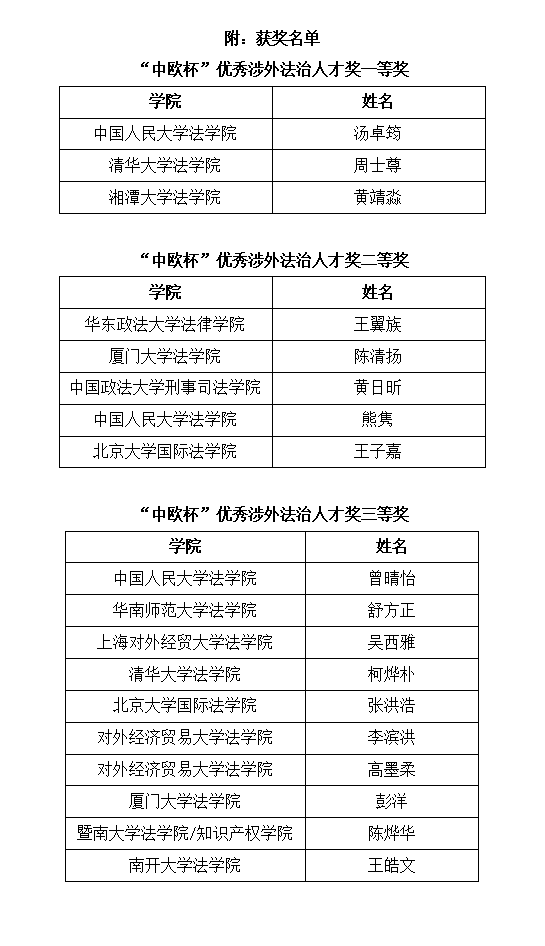 經(jīng)過激烈角逐,最終,中國人民大學(xué)湯卓筠、清華大學(xué)周士尊、湘潭大學(xué)黃靖淼3名選手榮獲“中歐杯”優(yōu)秀涉外法治人才一等獎。另有22名選手分別獲“中歐杯”優(yōu)秀涉外法治人才二等獎、三等獎、“涉外法治人才氣質(zhì)風(fēng)尚獎”“涉外法治人才團(tuán)隊(duì)合作獎”等。在5月26日下午舉行的閉幕式暨頒獎儀式上,中國政法大學(xué)黨委副書記王立艷、中倫律師事務(wù)所高級顧問王霽虹等為選手頒獎。獲獎同學(xué)同時獲得“中倫涉外英才獎學(xué)金”。