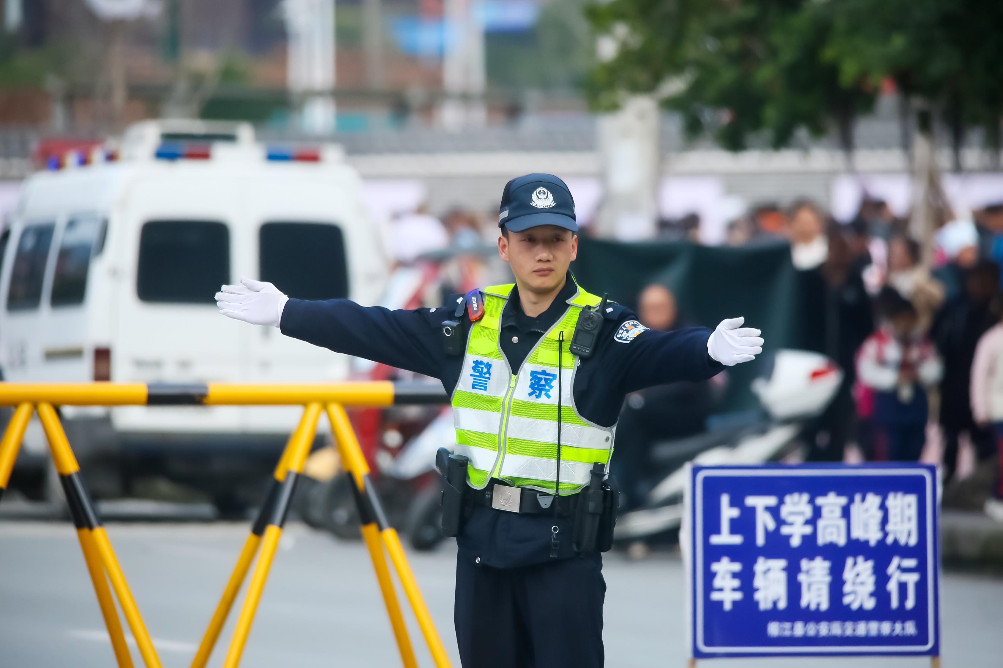 貴州省榕江縣公安局交通警察大隊(duì)民警在校園周邊路口疏導(dǎo)過往車輛