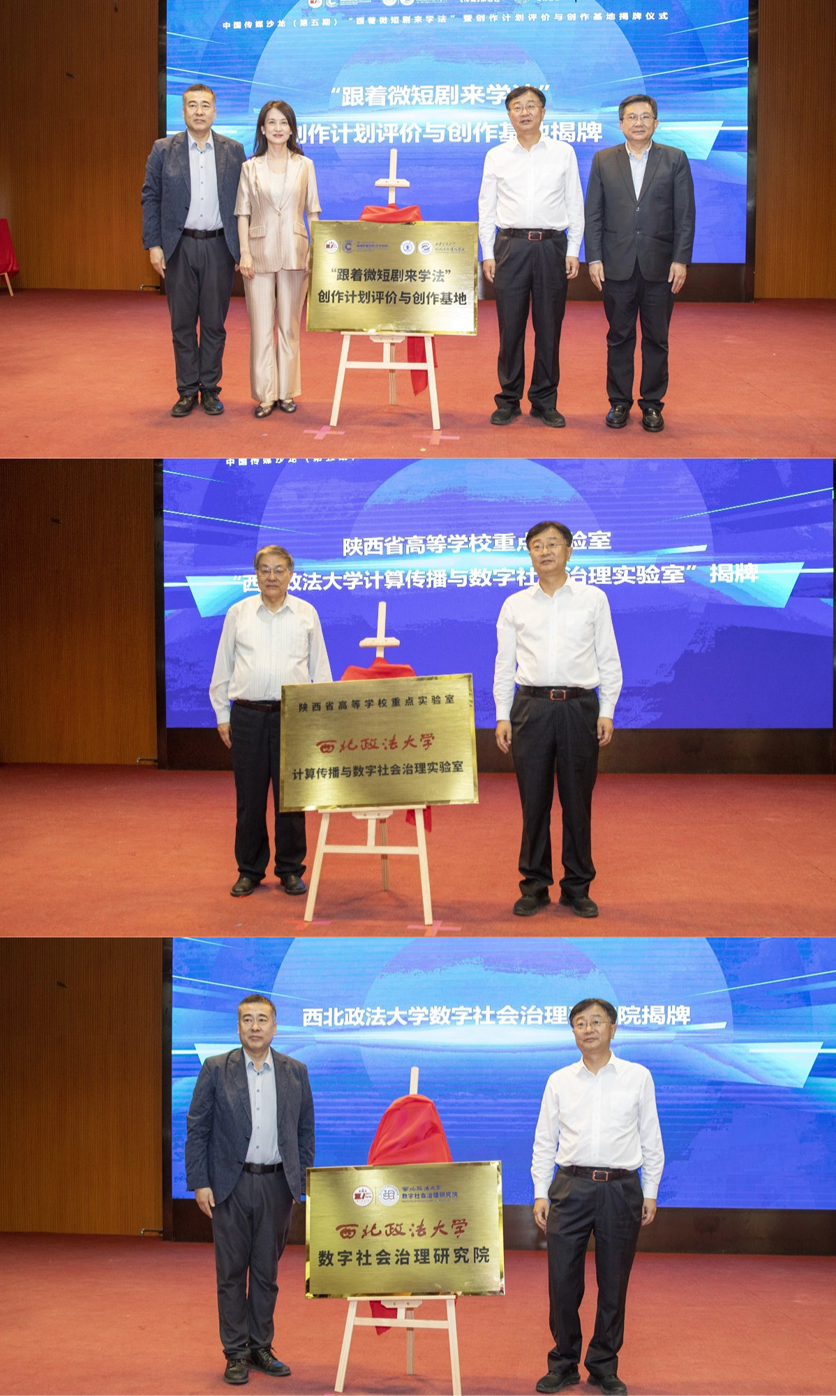 開幕式上,范九利與闞平共同為“跟著微短劇來學(xué)法”創(chuàng)作計(jì)劃評(píng)價(jià)與創(chuàng)作基地揭牌。隨后,孫憲忠與范九利為西北政法大學(xué)“計(jì)算傳播與數(shù)字社會(huì)治理陜西省高等學(xué)校重點(diǎn)實(shí)驗(yàn)室”揭牌,范九利與西北政法大學(xué)新聞傳播學(xué)院(藝術(shù)學(xué)院)院長孫江為西北政法大學(xué)數(shù)字社會(huì)治理研究院揭牌。該實(shí)驗(yàn)室及研究院將持續(xù)整合學(xué)校內(nèi)外法學(xué)、新聞傳播學(xué)與計(jì)算機(jī)科學(xué)資源,探索AI劇本生成、虛擬庭審場景等技術(shù)應(yīng)用,為普法宣傳提供技術(shù)支撐。