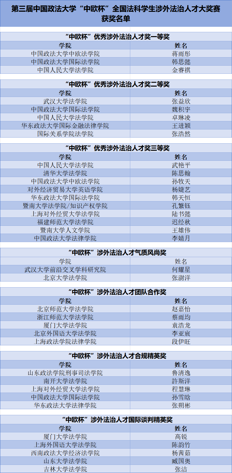 經(jīng)過激烈角逐,最終來自全國28所法學(xué)院系的35名同學(xué)脫穎而出。復(fù)賽共評選出:“中歐杯”優(yōu)秀涉外法治人才一等獎(jiǎng)3名、二等獎(jiǎng)5名、三等獎(jiǎng)10名,“涉外法治人才氣質(zhì)風(fēng)尚獎(jiǎng)”2名,“涉外法治人才團(tuán)隊(duì)合作獎(jiǎng)”5名,“涉外法治人才合規(guī)精英獎(jiǎng)”5名,“涉外法治人才國際談判精英獎(jiǎng)”5名。