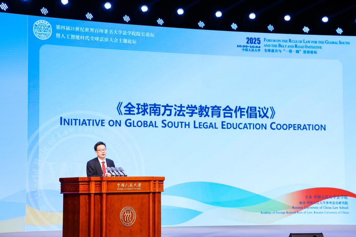 圖為中國人民大學法學院院長楊東在論壇主會場開幕式上發(fā)布《全球南方法學教育合作倡議》。