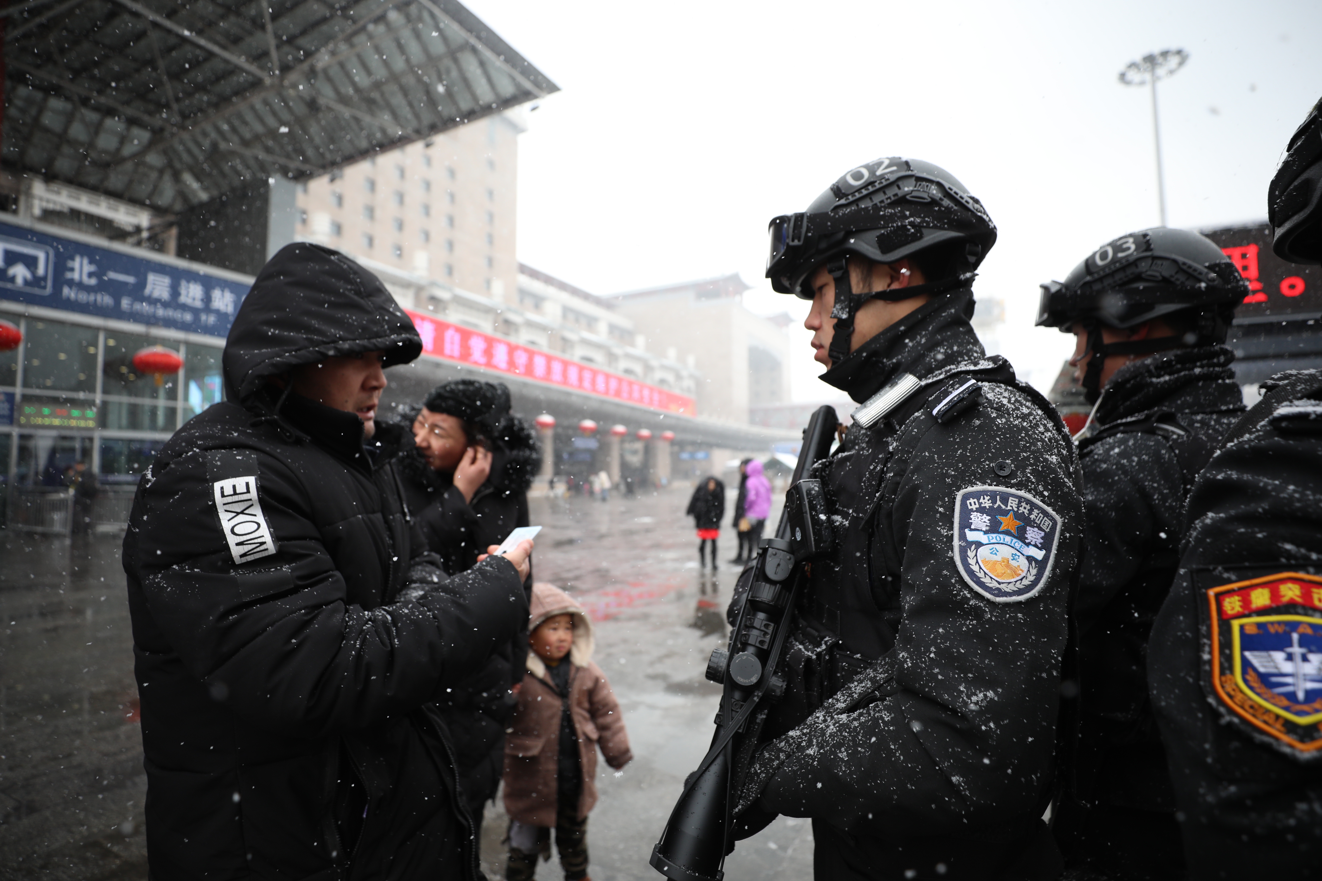 春運以來,北京鐵路公安處安排特警駐守北京站、北京西站、北京南站,加強對3大火車站的巡邏巡視、武裝震懾和盤查工作,全力確保車站治安秩序穩(wěn)定。圖為2月12日,北京大雪,參加安保任務(wù)的特警隊員們在北京各大火車站值守?! ?/p>
