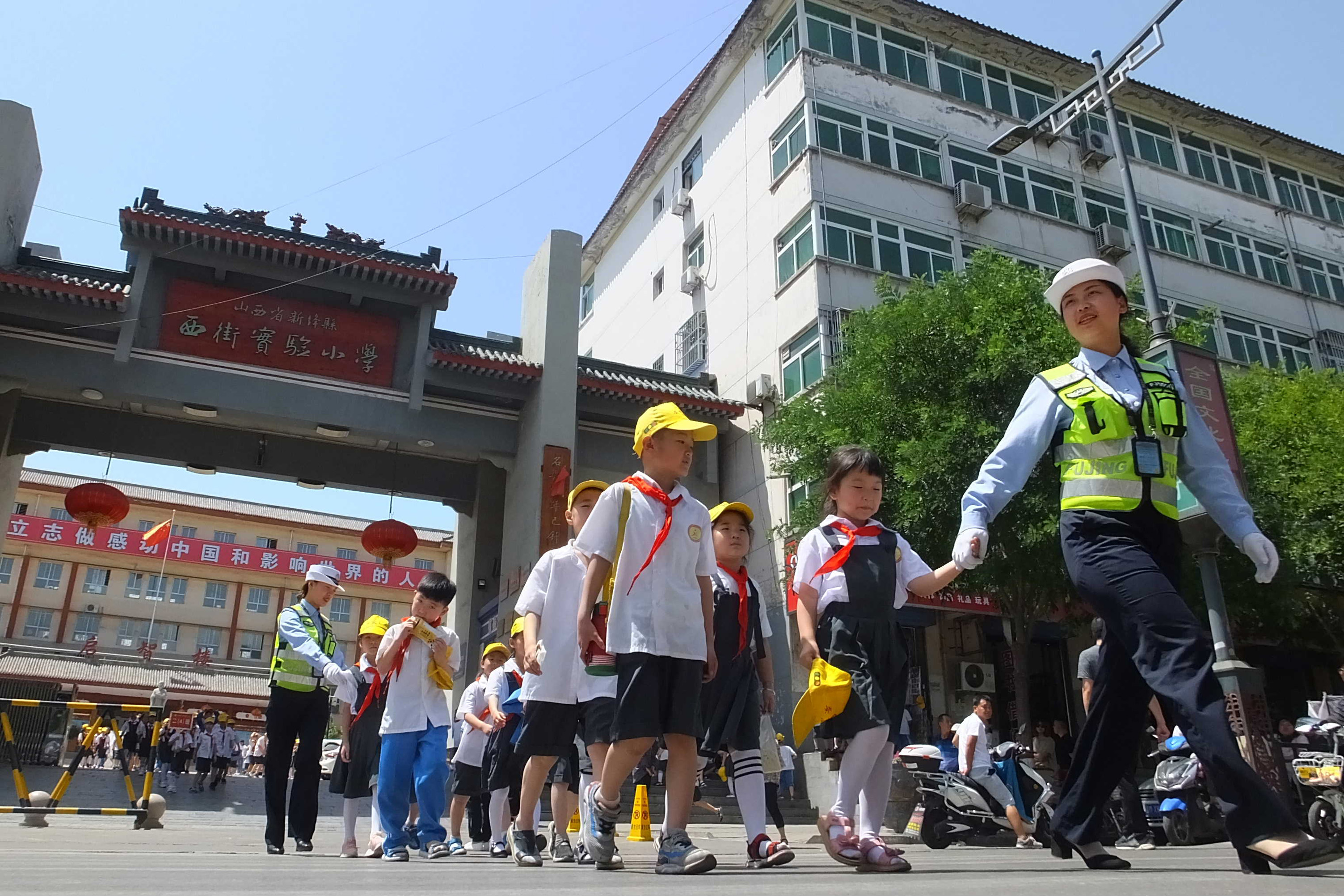 6月3日,山西運(yùn)城市新絳縣公安交警大隊(duì)古城中隊(duì)的交警們?cè)谖鹘謱?shí)驗(yàn)小學(xué)大門前接力護(hù)送中午放學(xué)的小學(xué)生安全過馬路。 新絳縣作為山西省教育大縣,護(hù)送中小學(xué)生安全上下學(xué)已成為當(dāng)?shù)亟痪囊豁?xiàng)日常工作。雖然幾十年中交警換了一茬又一茬,好多交警已退休,但“接力護(hù)航”的接力棒在一批批交警手中傳遞,確保了幾十年來無一起重特大中小學(xué)生交通事故發(fā)生。