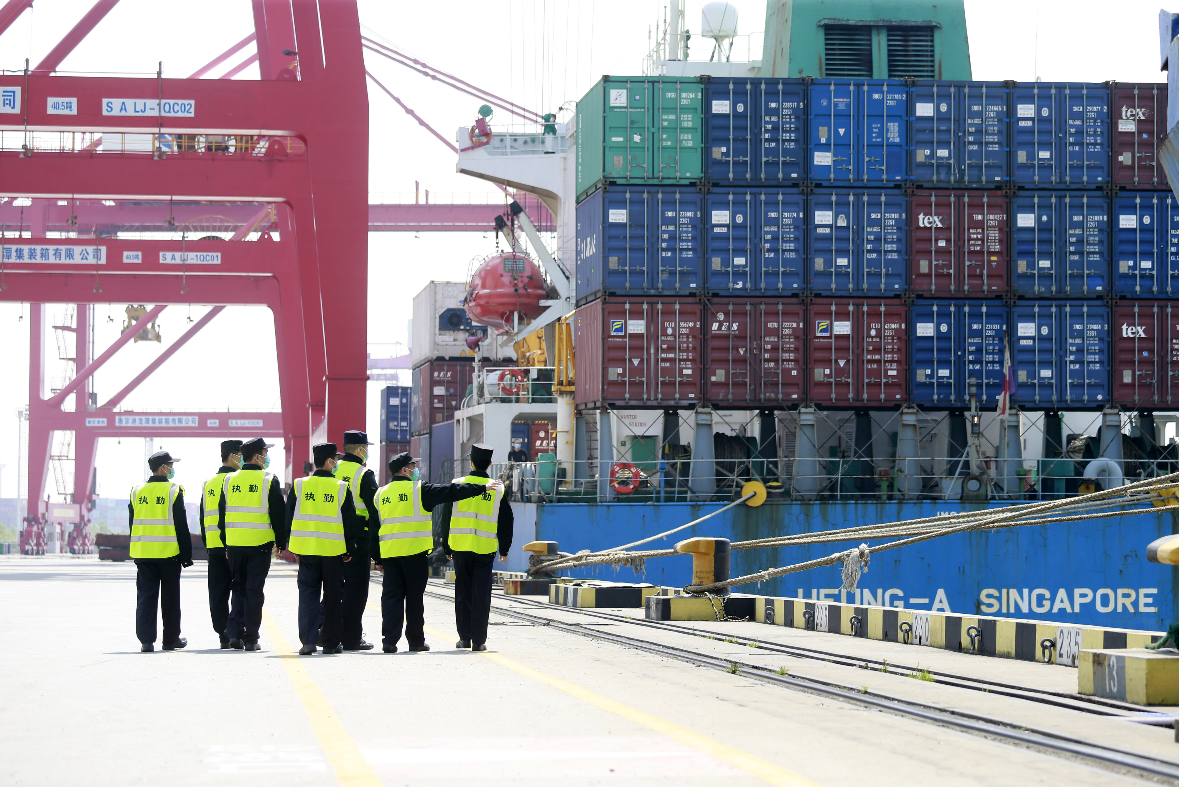 4月27日,在南京港出入境邊檢站民警的帶領(lǐng)下,廣西籍輔警參與碼頭巡邏。