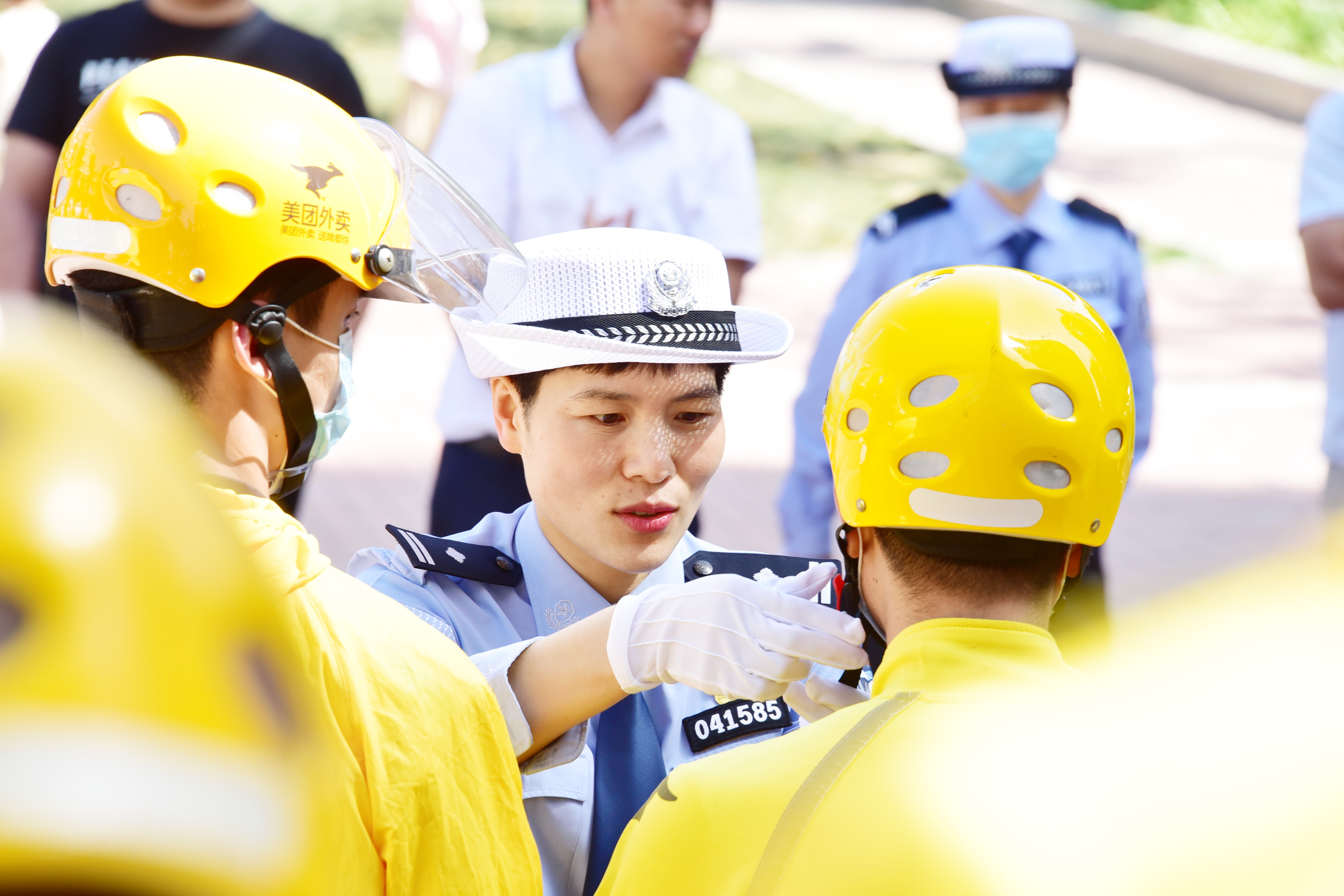 5月18日,安徽省阜南縣交警在向一外賣(mài)人員講解如何正確佩戴頭盔。為提升摩托車(chē)、電動(dòng)自行車(chē)騎乘人員安全意識(shí),當(dāng)日,阜南縣公安局交警大隊(duì)按照公安部交通管理局部署在全國(guó)開(kāi)展“一盔一帶”安全守護(hù)行動(dòng)部署,聯(lián)合外賣(mài)公司開(kāi)展“一盔一帶”示范活動(dòng),民警通過(guò)現(xiàn)場(chǎng)講解和演示正確佩戴頭盔安全駕駛的重要性,增強(qiáng)外賣(mài)人員出行安全意識(shí)。