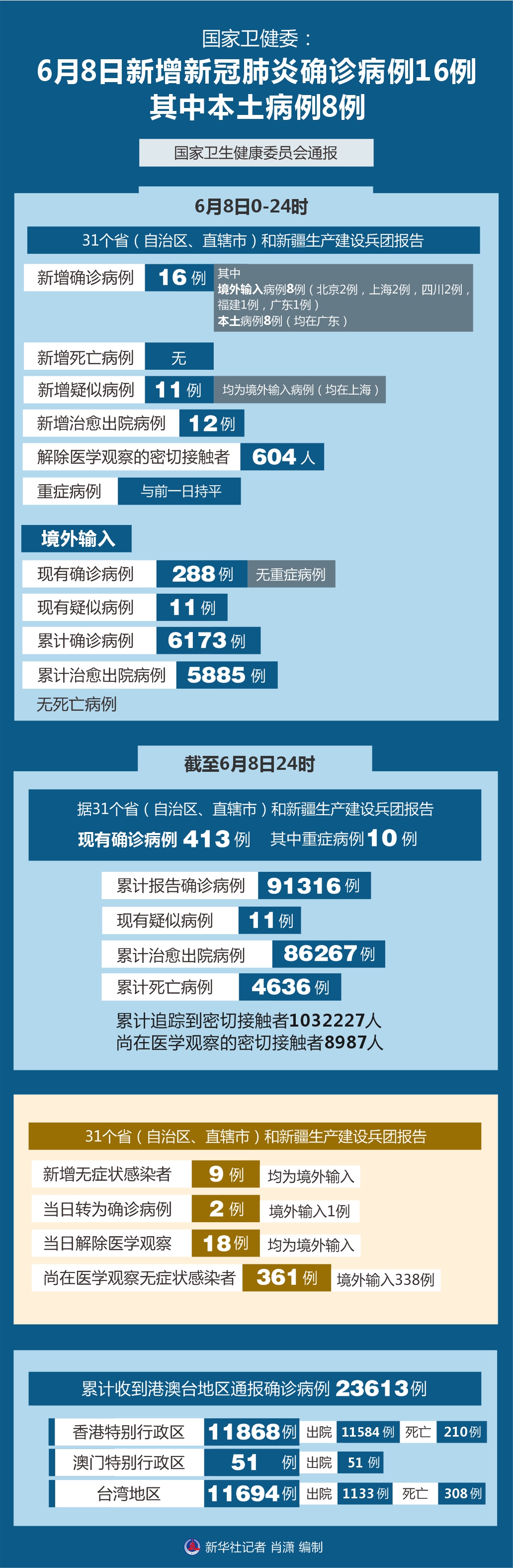 圖表:國家衛(wèi)健委:6月8日新增新冠肺炎確診病例16例 其中本土病例8例