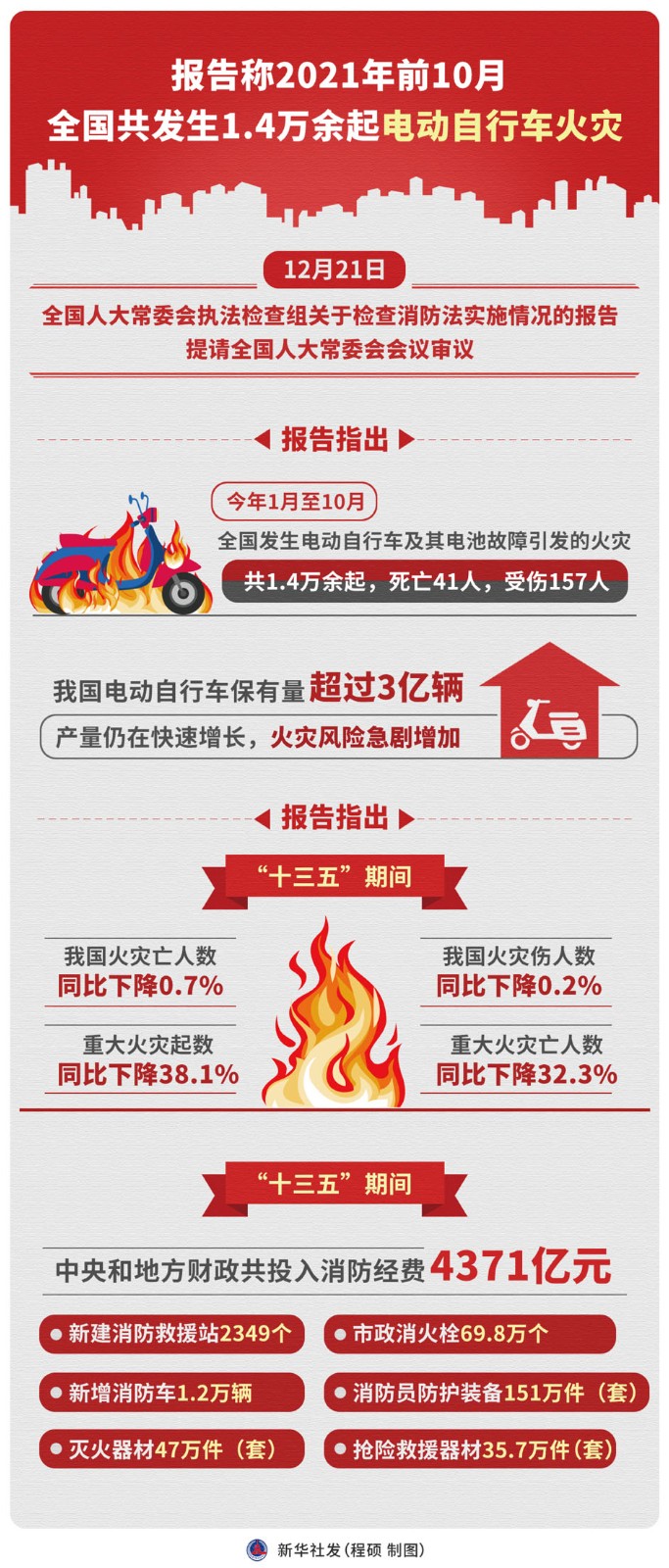 12月21日,全國(guó)人大常委會(huì)執(zhí)法檢查組關(guān)于檢查消防法實(shí)施情況的報(bào)告提請(qǐng)全國(guó)人大常委會(huì)會(huì)議審議。報(bào)告指出,今年1月至10月,全國(guó)發(fā)生電動(dòng)自行車及其電池故障引發(fā)的火災(zāi)共1.4萬(wàn)余起,死亡41人,受傷157人。