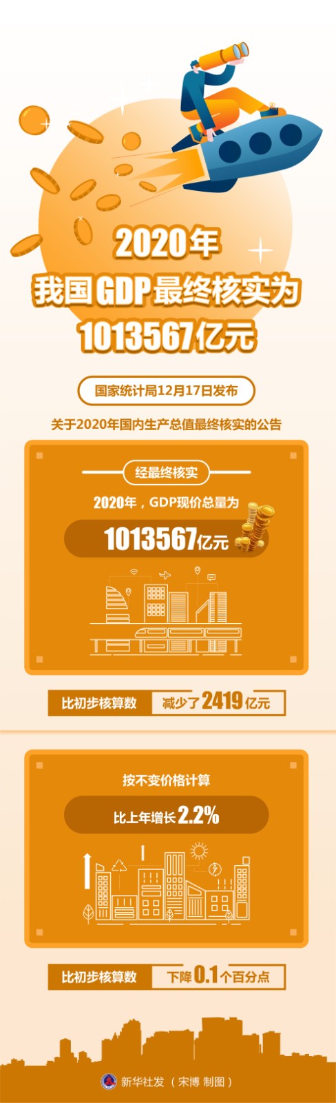 國家統(tǒng)計(jì)局12月17日發(fā)布關(guān)于2020年國內(nèi)生產(chǎn)總值最終核實(shí)的公告,經(jīng)最終核實(shí),2020年,GDP現(xiàn)價(jià)總量為1013567億元,比初步核算數(shù)減少了2419億元。